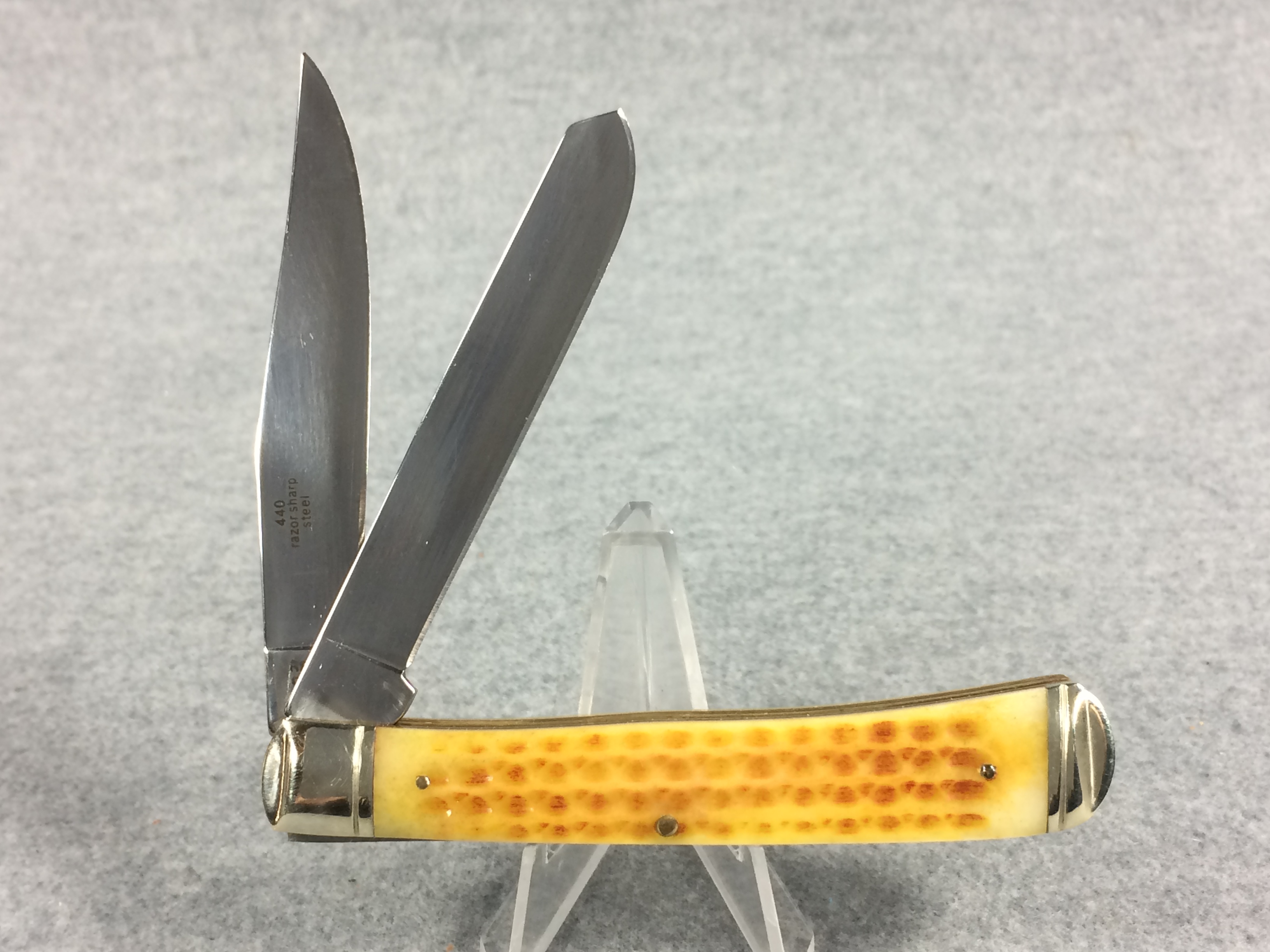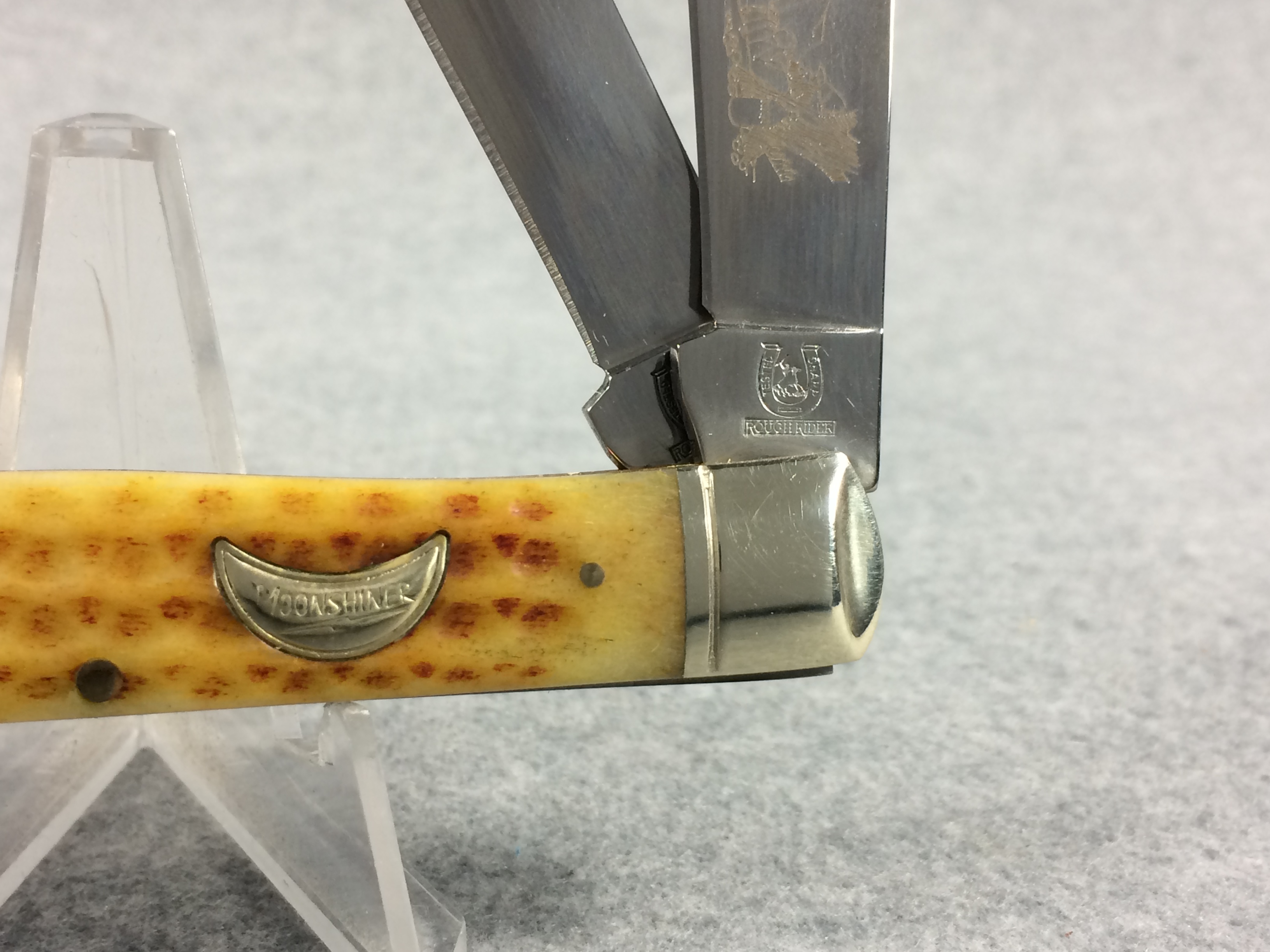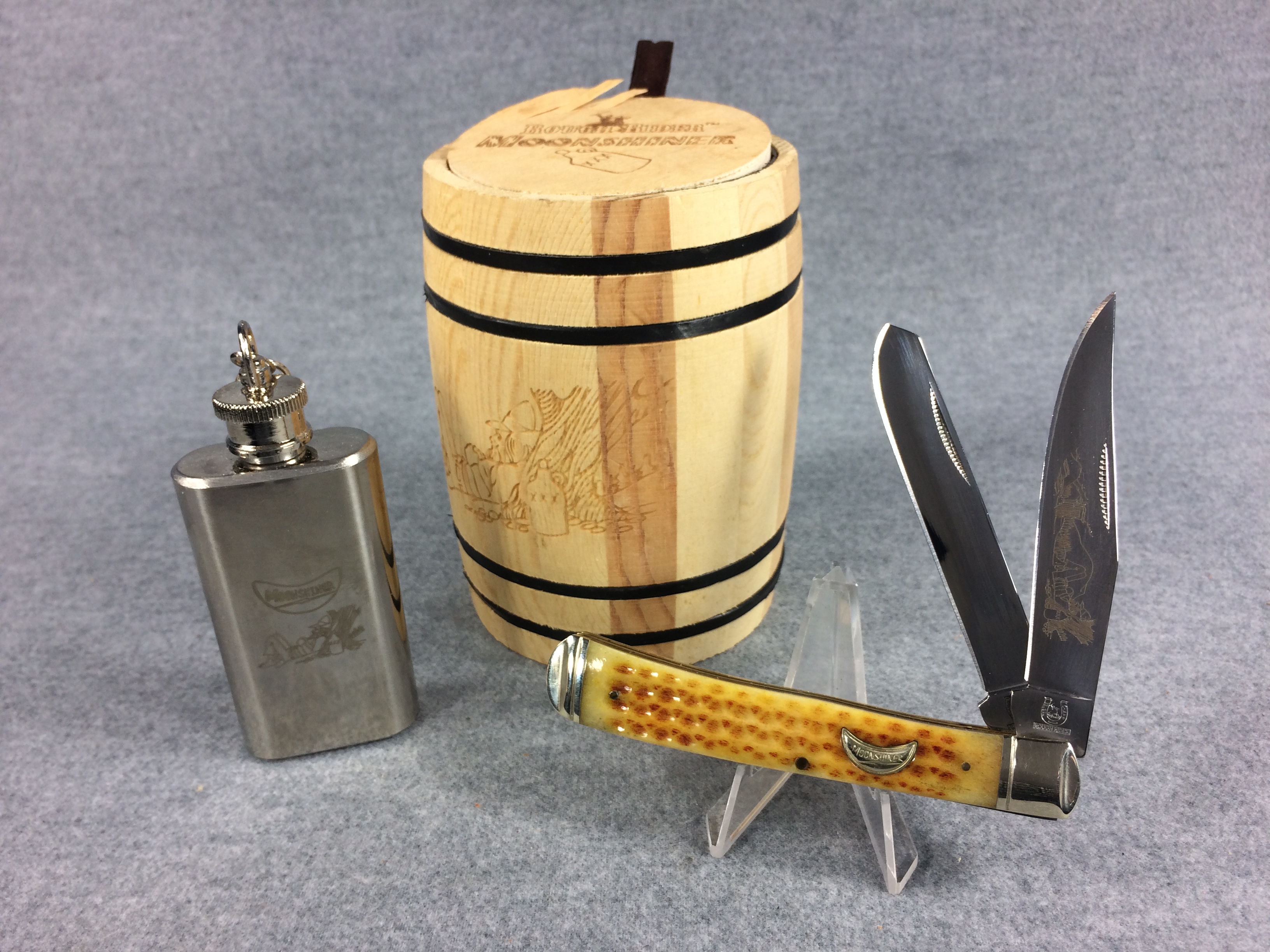 November 06, 2025 - 2-Blade TRapper Knife. 4-1/8 inches closed. 7-3/8 inches open. Rough Rider logo and "RR870 China" tang stamps. 440 razor sharp stainless steel blades etched "440 razor sharp steel" and with image of a Moonshiner. Light yellow jigged bone handle. Pinched bolsters. Brass liner. With stainless steel flask and barrel-shaped wooden storage/gift box.