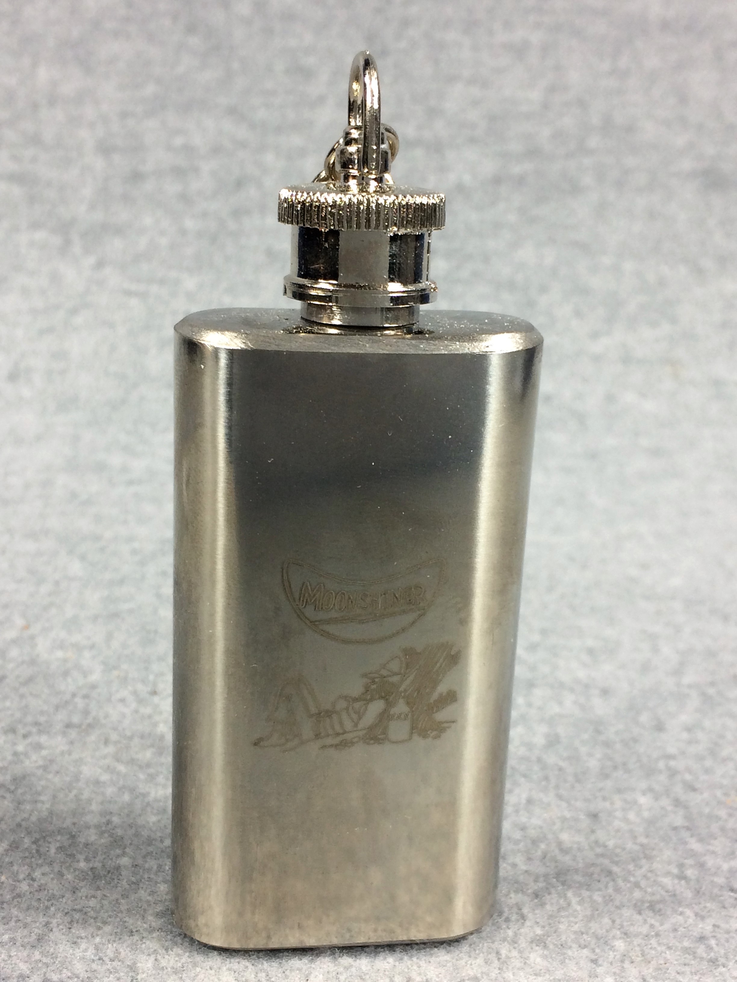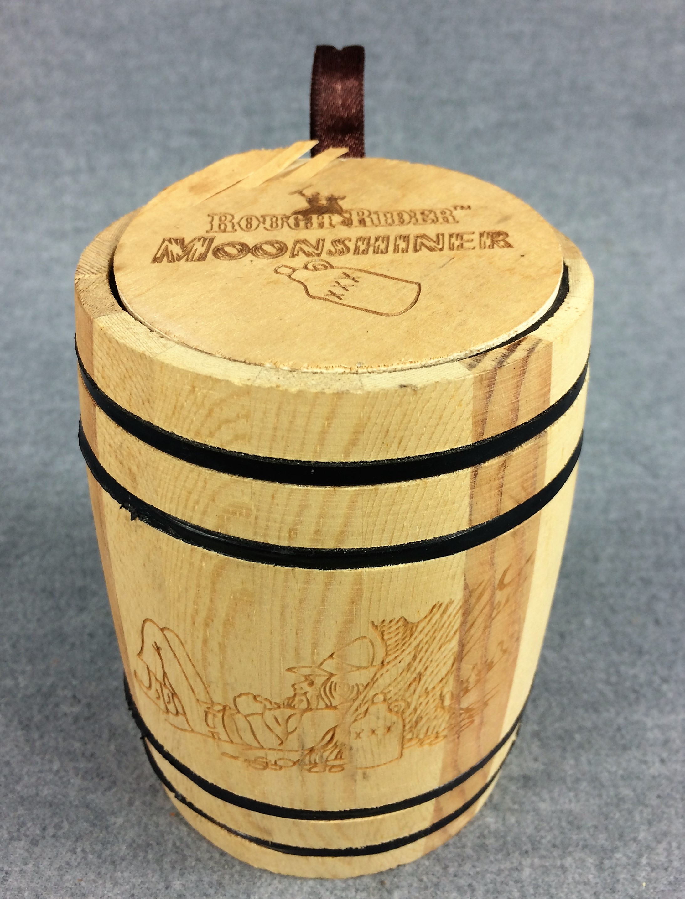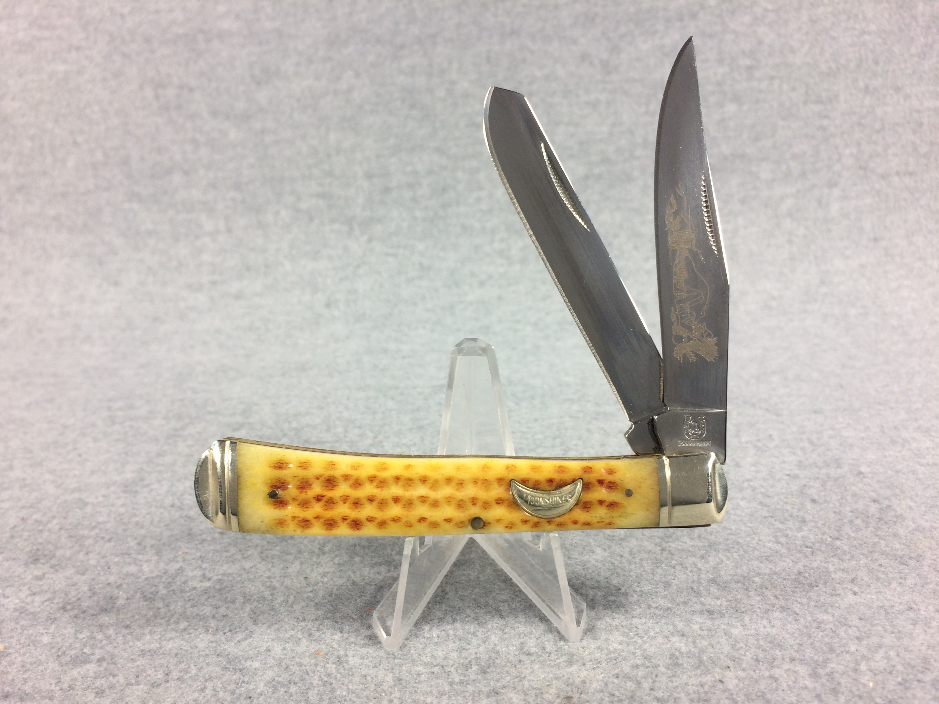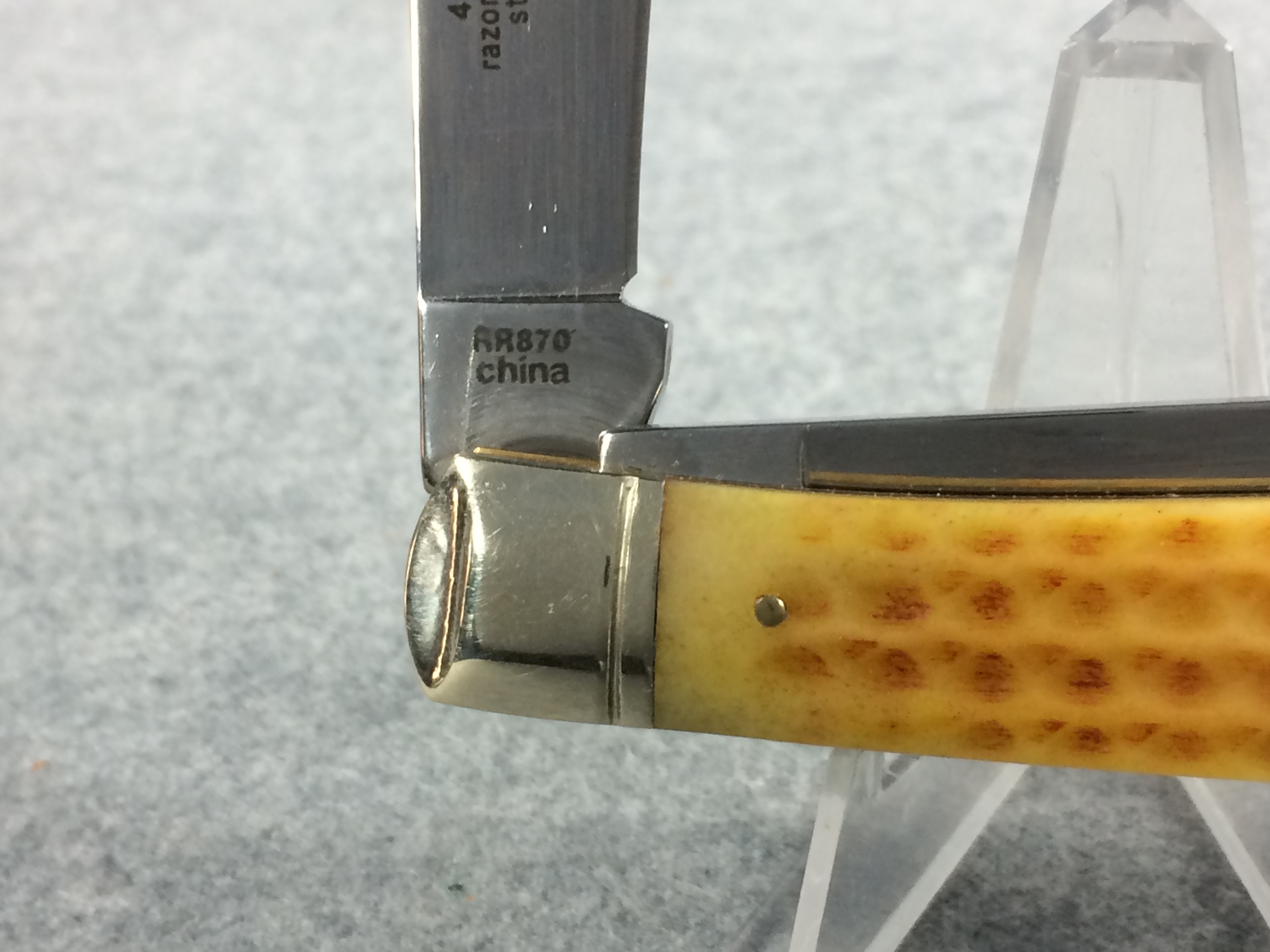 November 06, 2025 - 2-Blade TRapper Knife. 4-1/8 inches closed. 7-3/8 inches open. Rough Rider logo and "RR870 China" tang stamps. 440 razor sharp stainless steel blades etched "440 razor sharp steel" and with image of a Moonshiner. Light yellow jigged bone handle. Pinched bolsters. Brass liner. With stainless steel flask and barrel-shaped wooden storage/gift box.