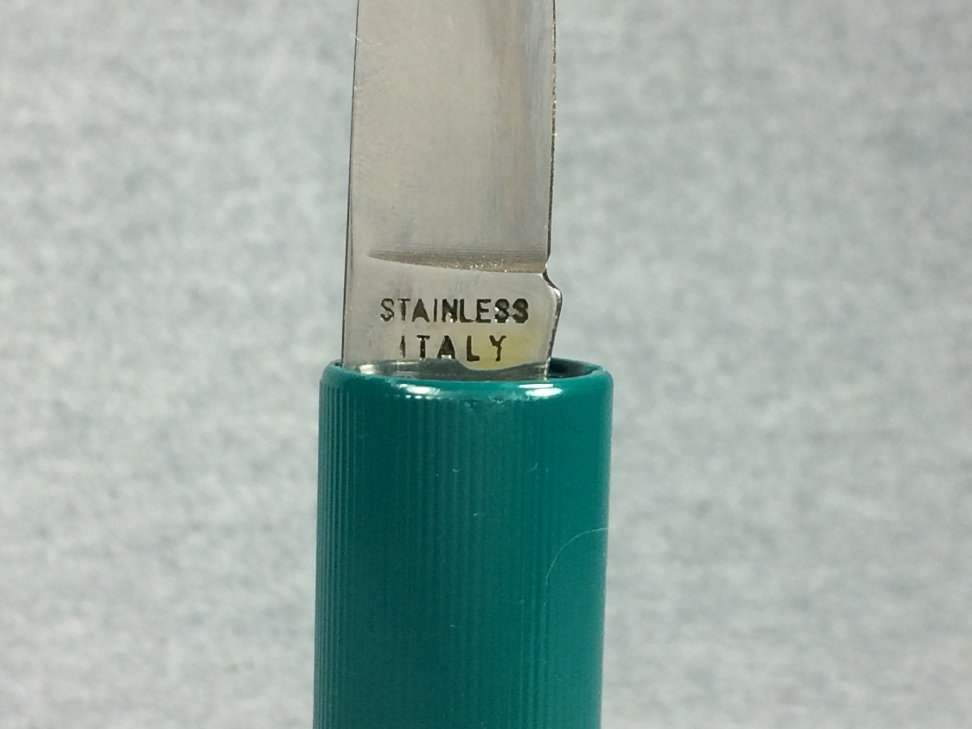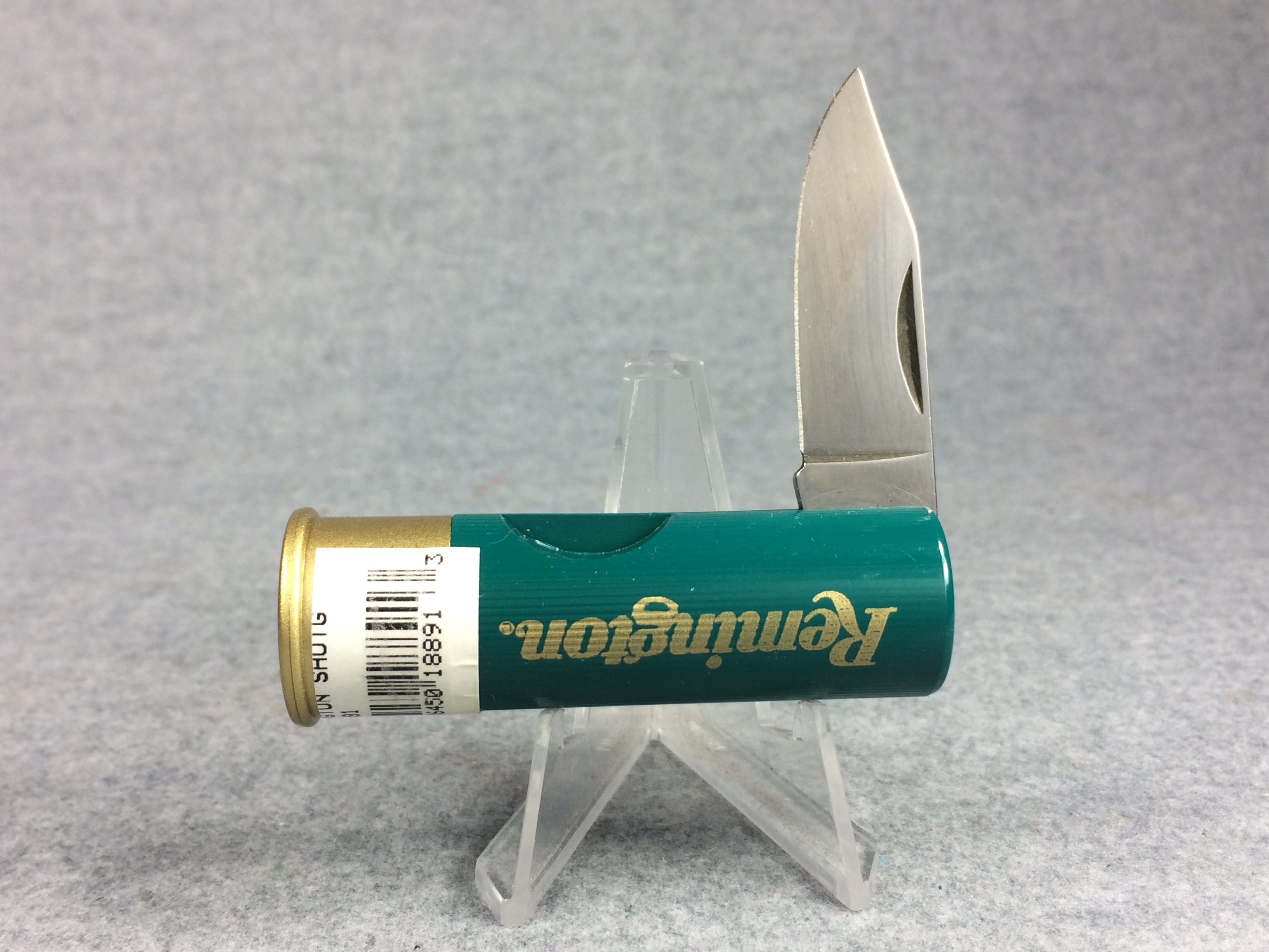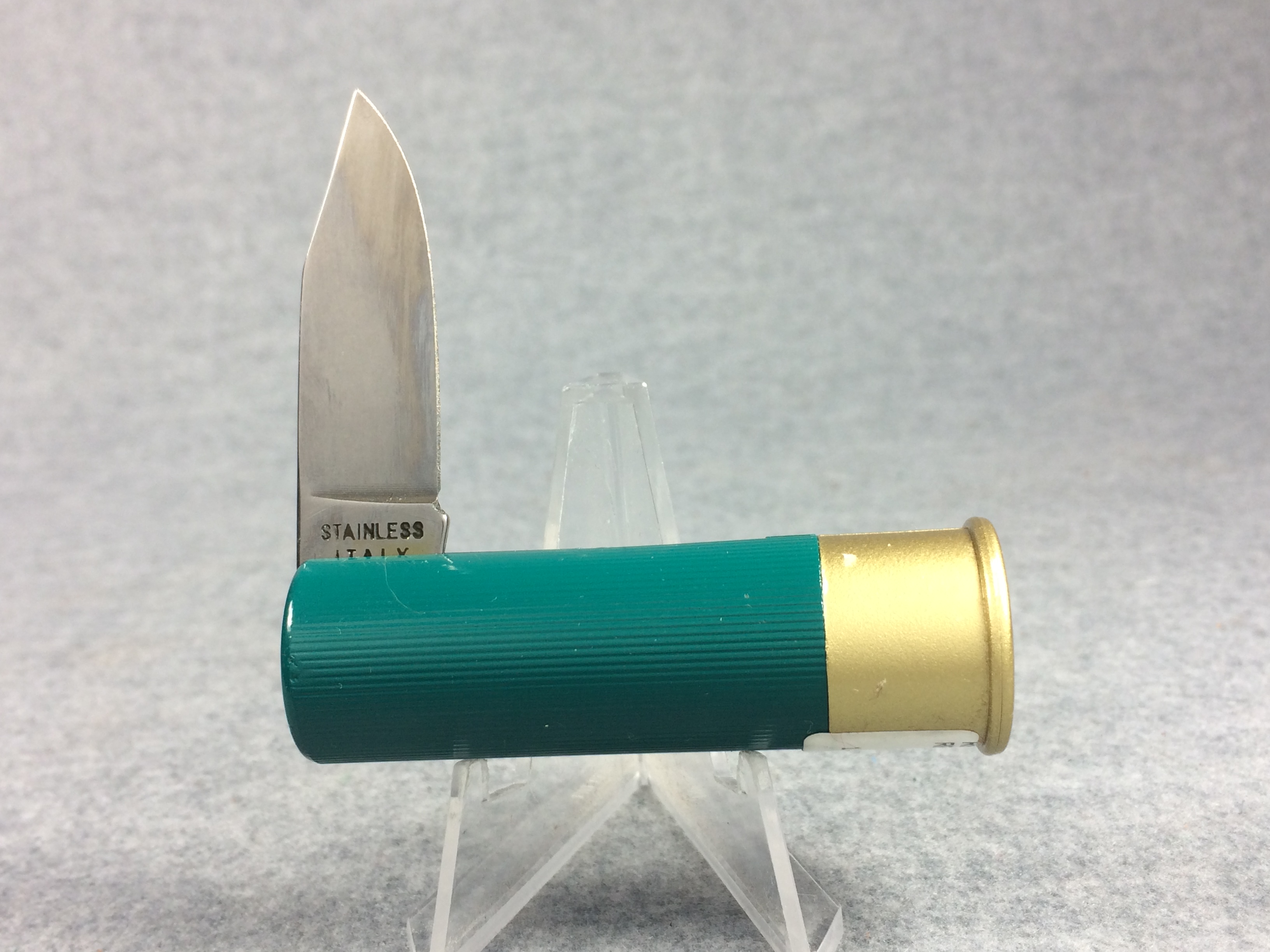 November 06, 2025 - "STAINLESS ITALY" tang stamp. 2-5/8 inches closed. 4-1/2 inches open. Green shotgun shell shaped handle stamped "Remington". No box.