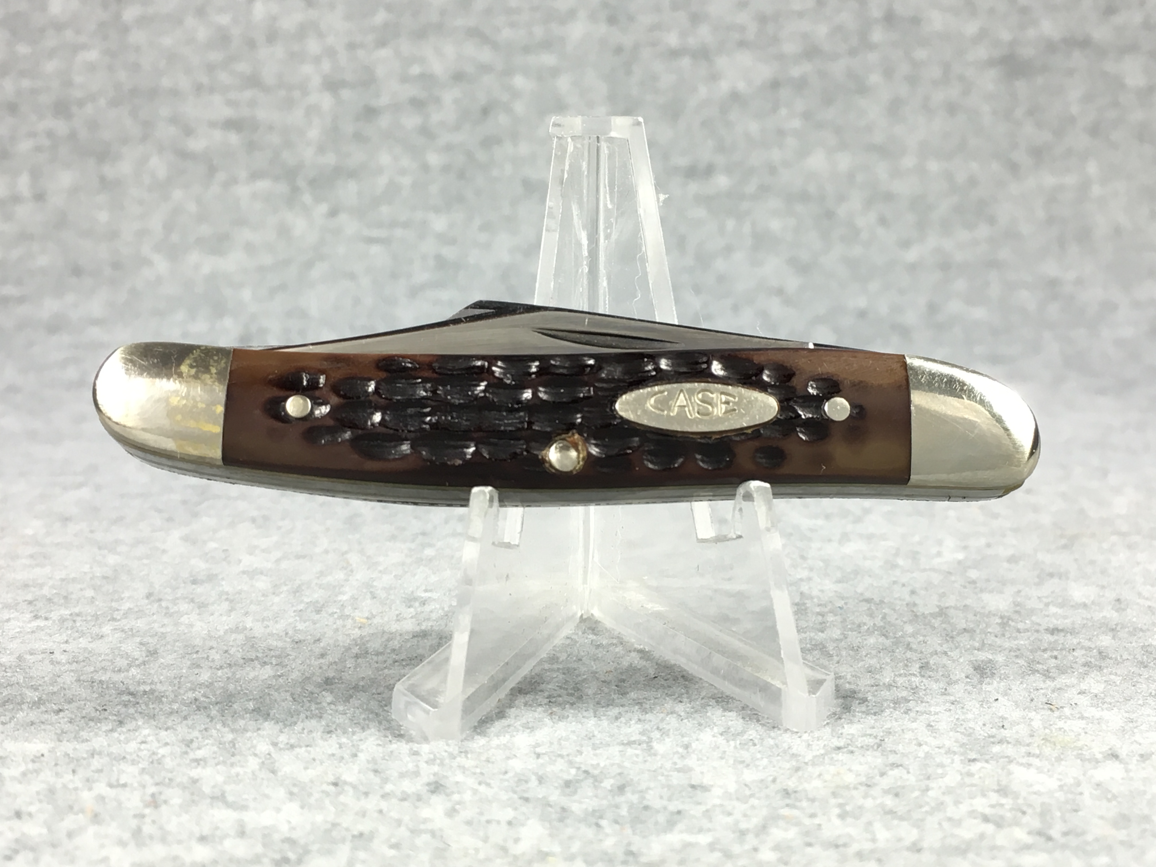 March 06, 2026 - 3-3/8 inches closed. 5-3/4 inches open. Made in USA. "CASE XX U.S.A. * " (1 dot) and "087PE" tang stamps. Single Oval 'Open C' Case shield. Chrome vanadium blades. Jigged delrin handle. Nickel Silver bolsters. Brass liner.