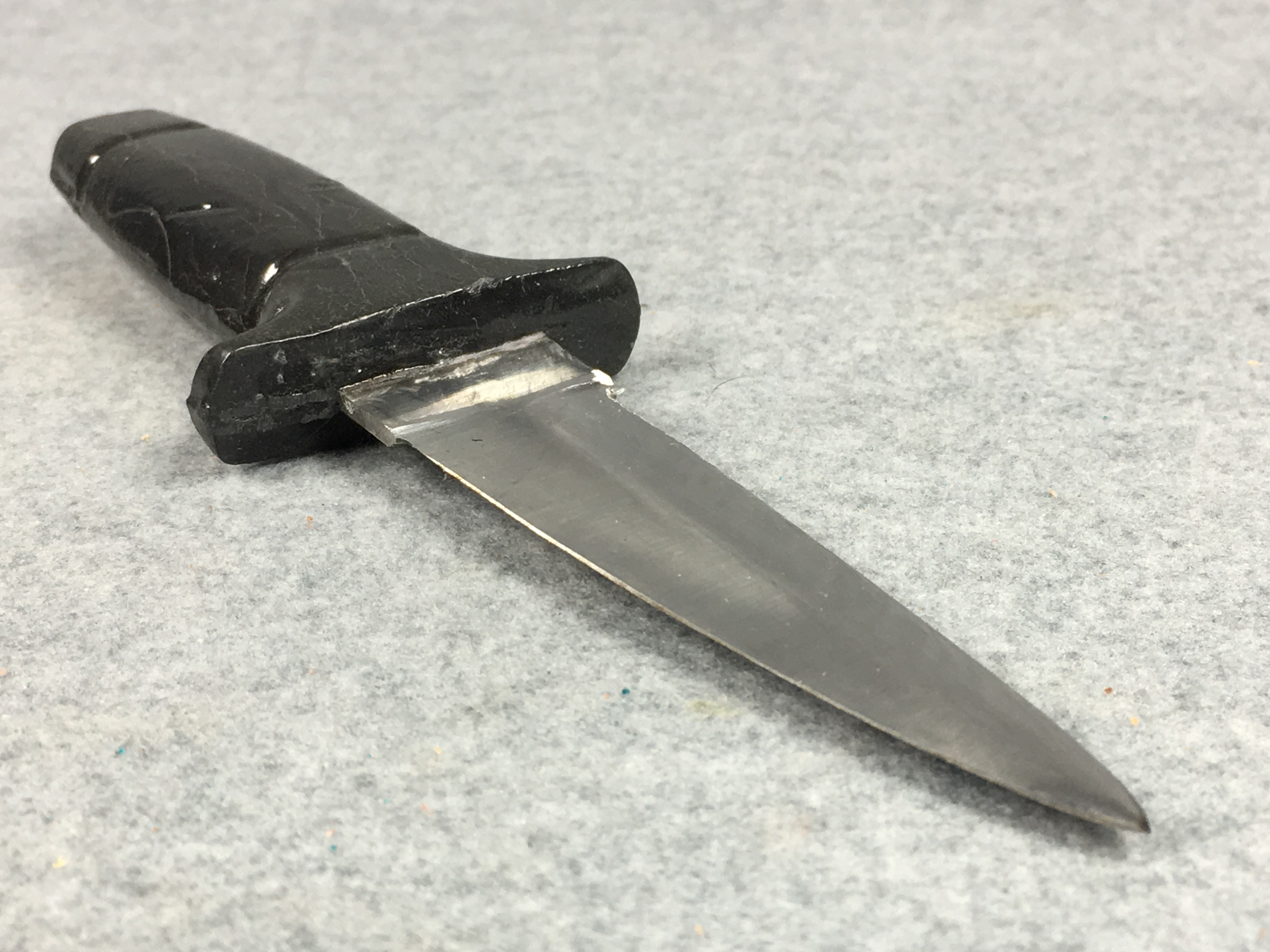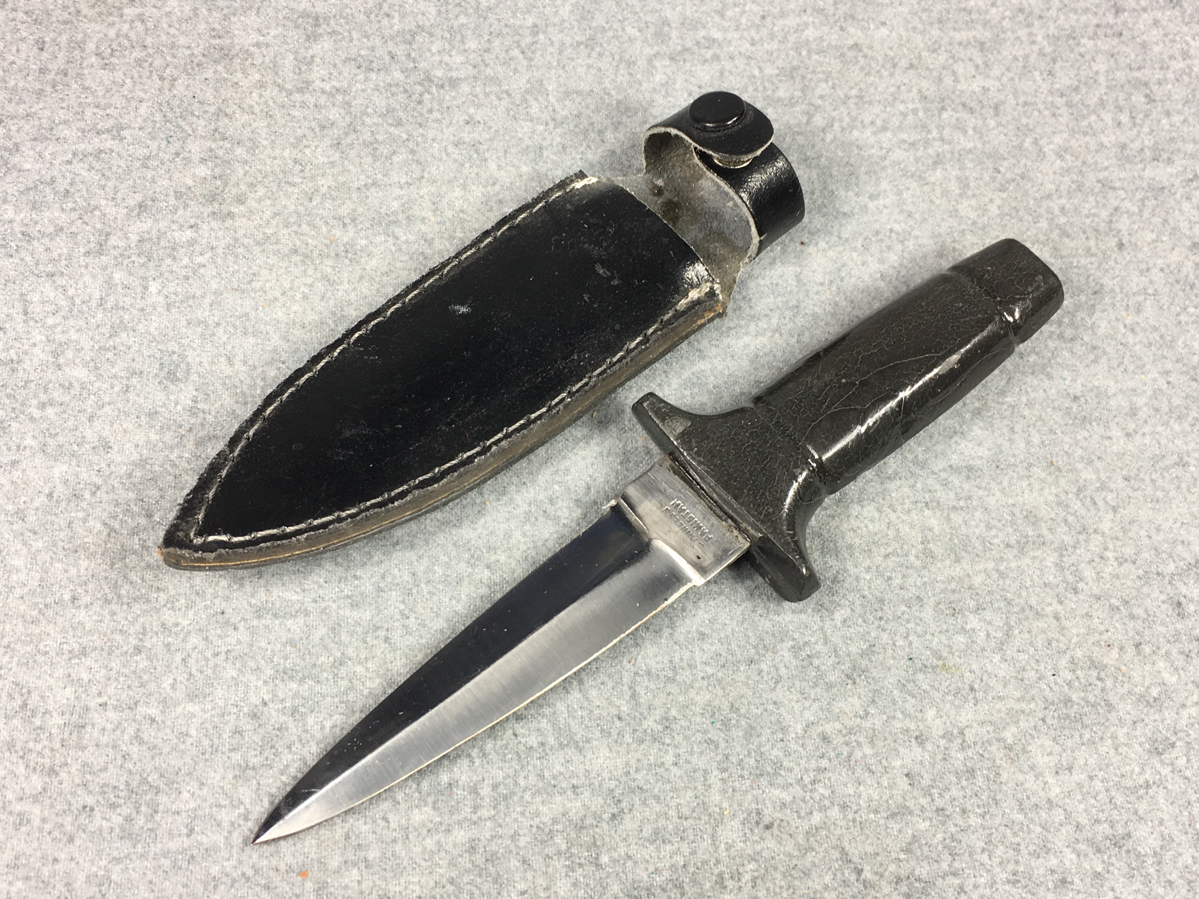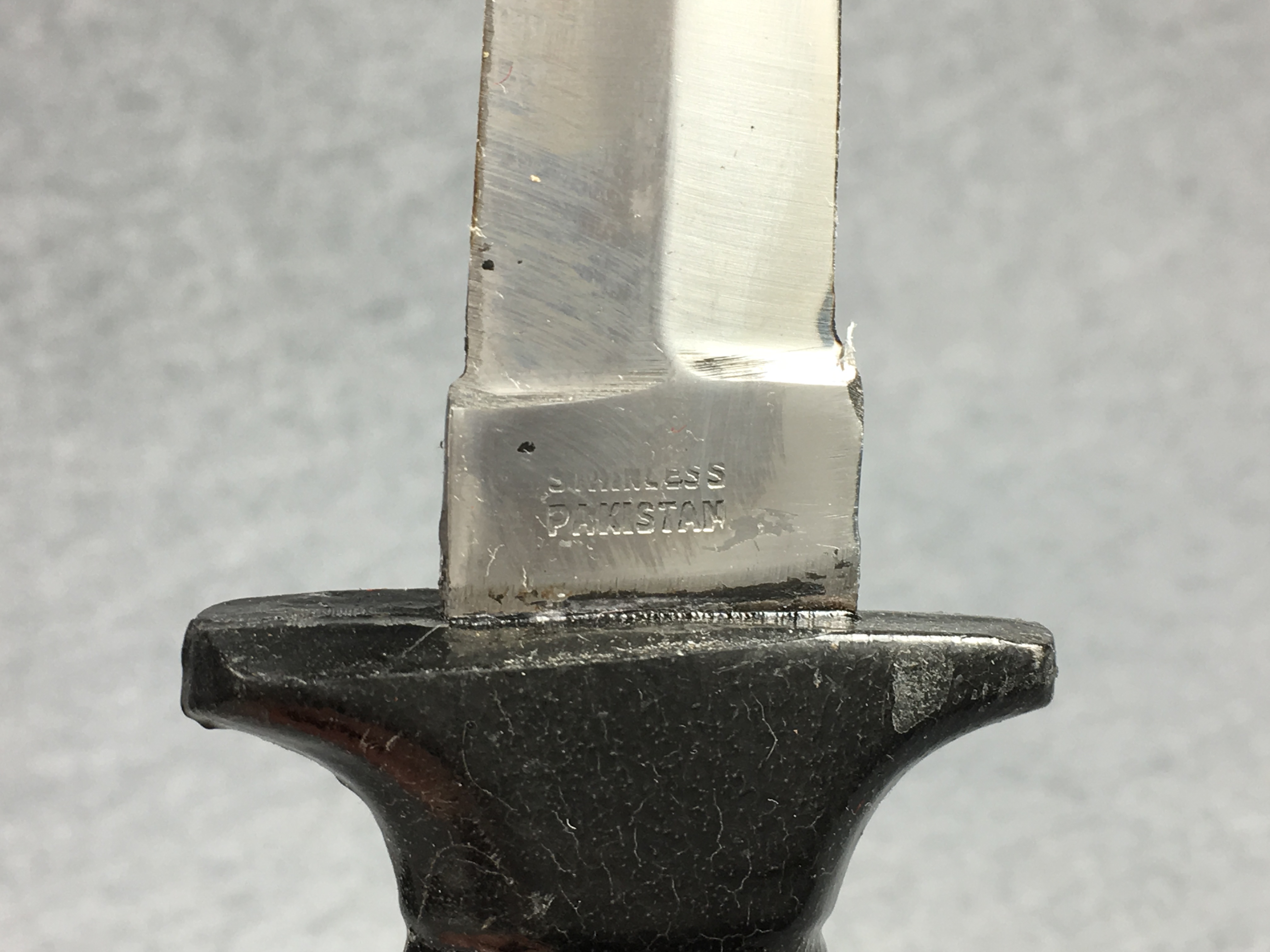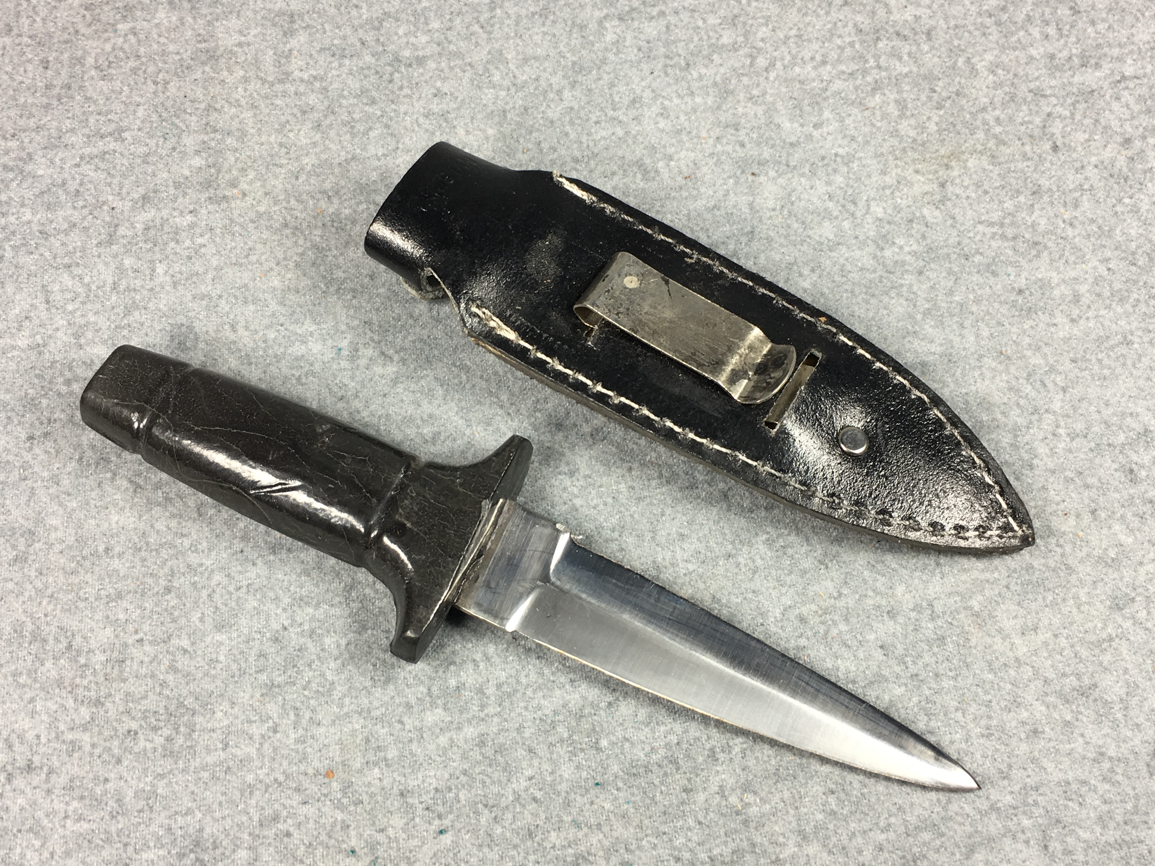 November 06, 2025 - Fixed blade dagger knife. 7-1/8 inches long. "STAINLESS PAKISTAN" tang stamp. With leather sheath.