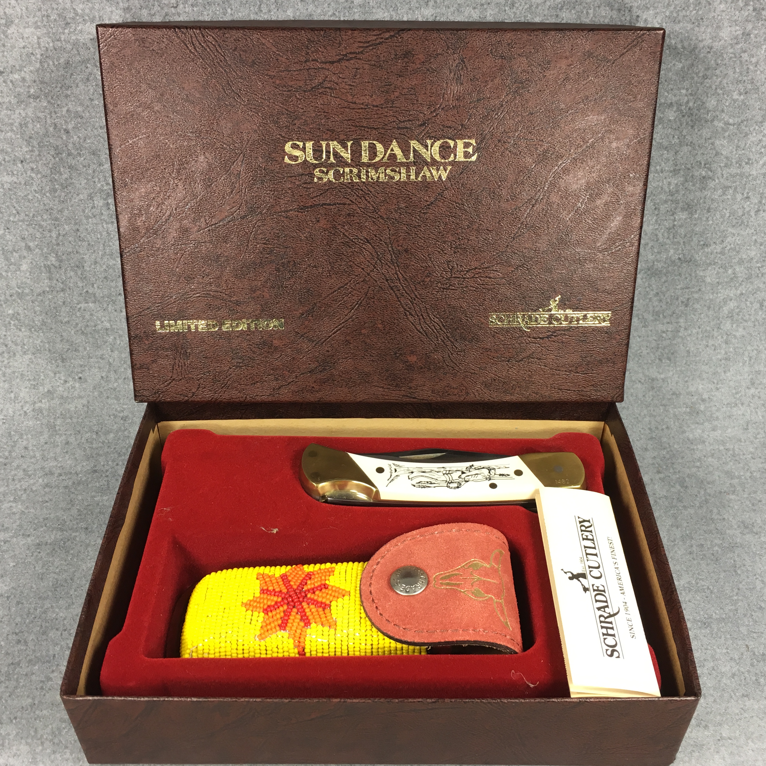 You have: Rare 1980s SCHRADE Scrimshaw SUNDANCE Limited Ed. Lockblade Knife w/ Beaded Sheath