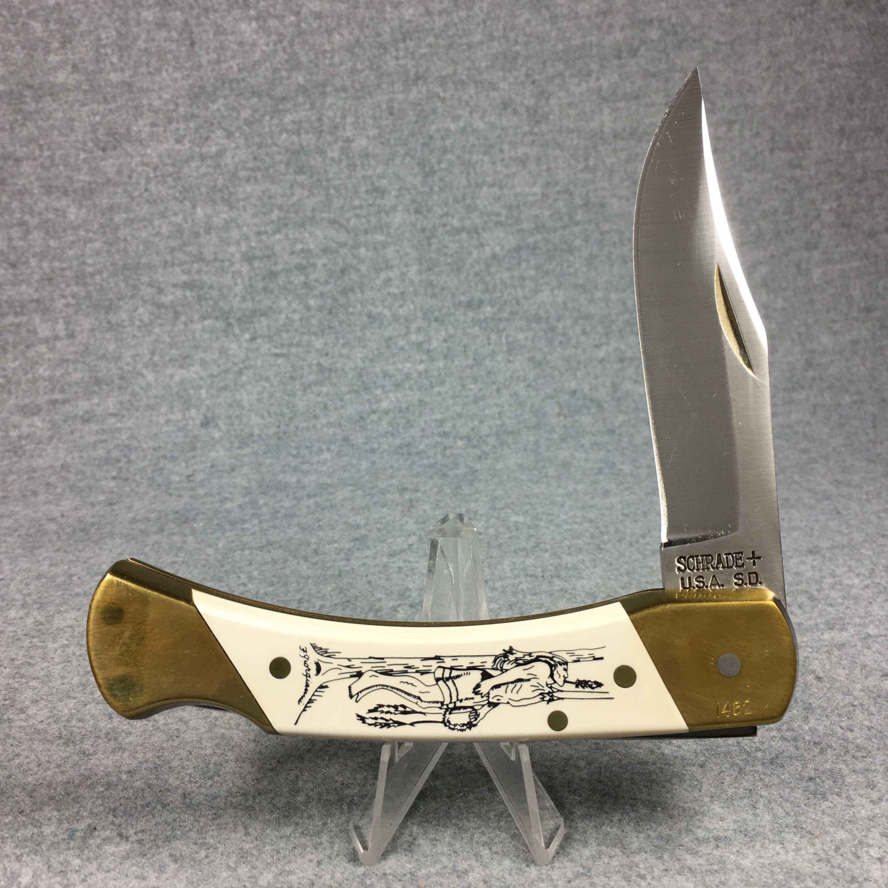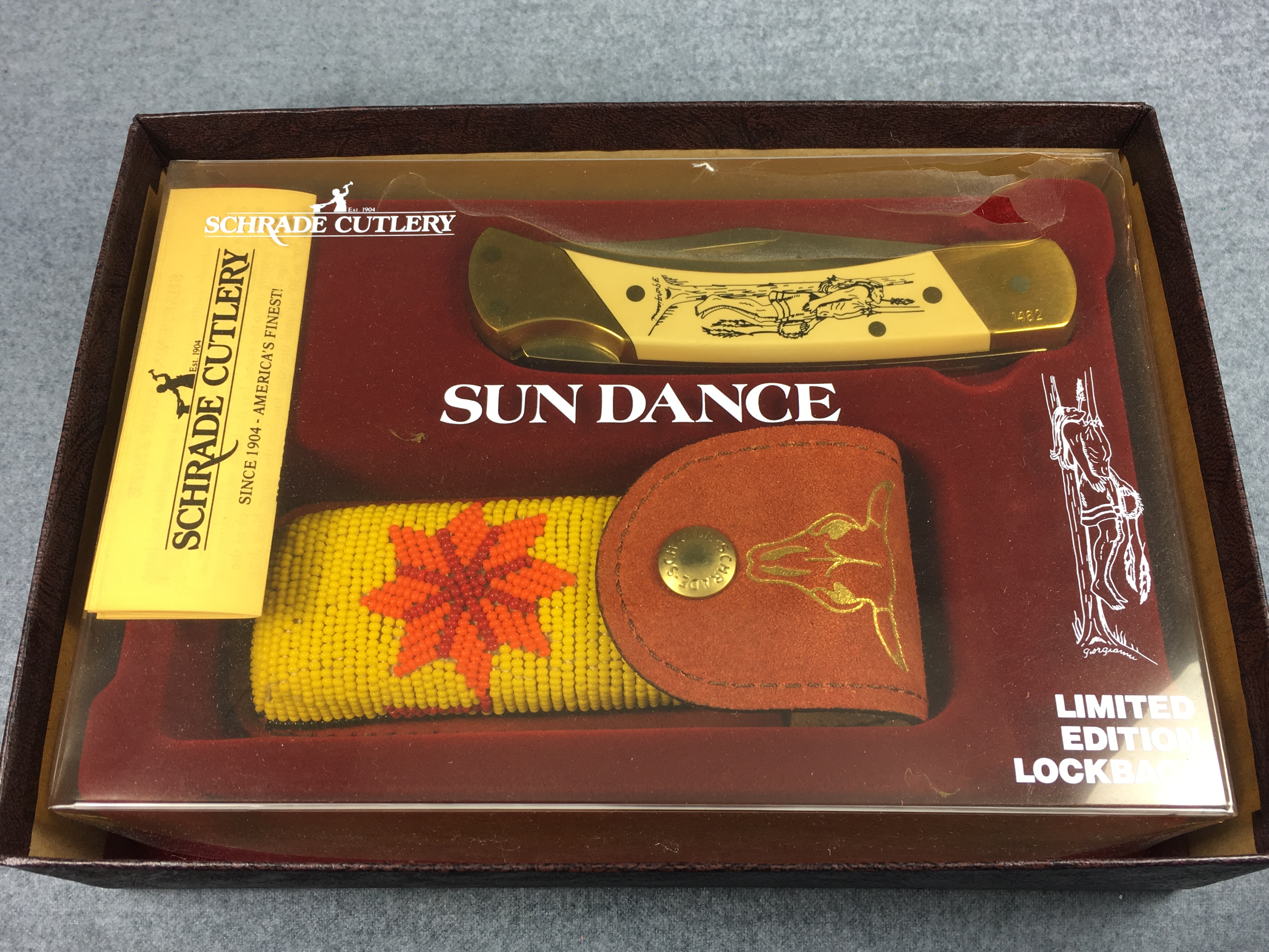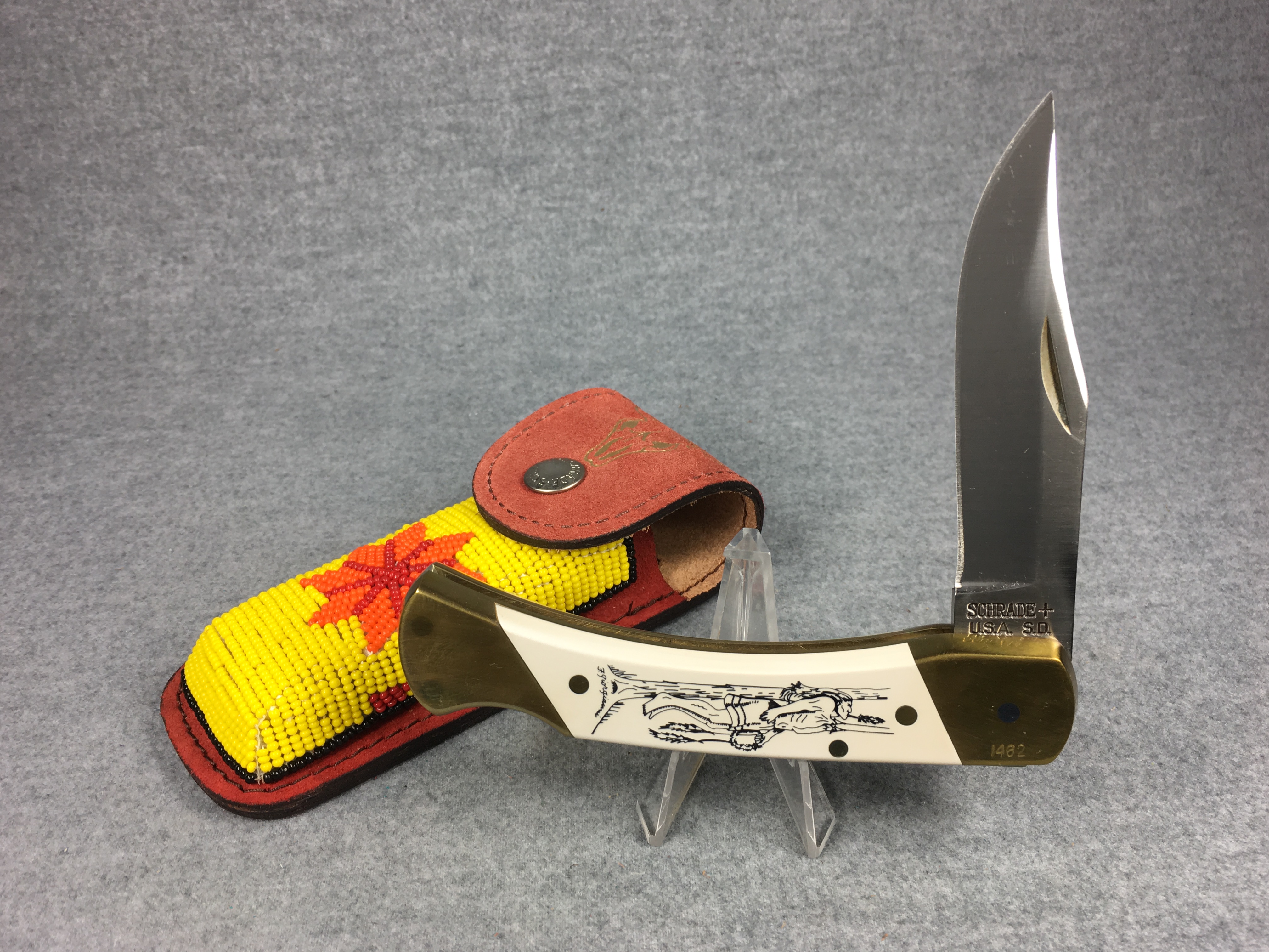 December 22, 2025 - Single Blade Limited Edition #1462 Lockblade Knife. 5  inches closed. 8-3/4 inches open. Made in USA. "SCHRADE+ U.S.A S.D. " tang stamp. Handle scrimshawed with Native American images. Brass bolsters. Front right bolster etched with serial #1462. Brass liner. With original box, paperwork, and beaded sheath.
