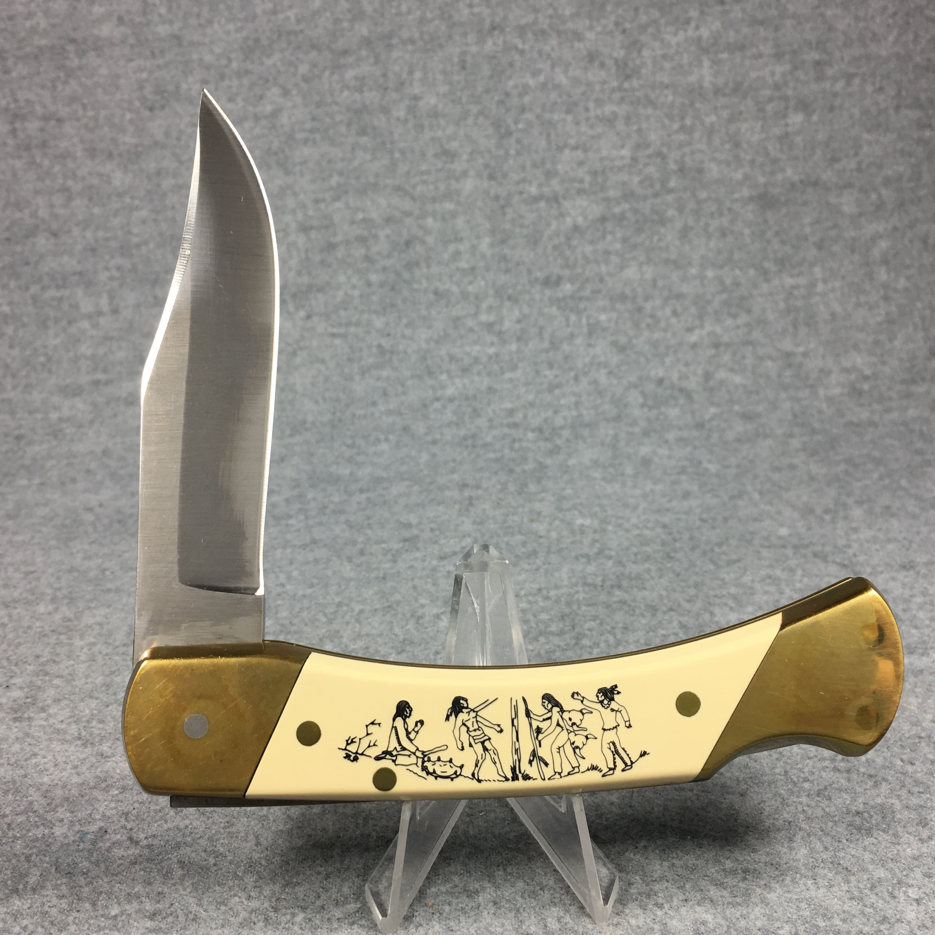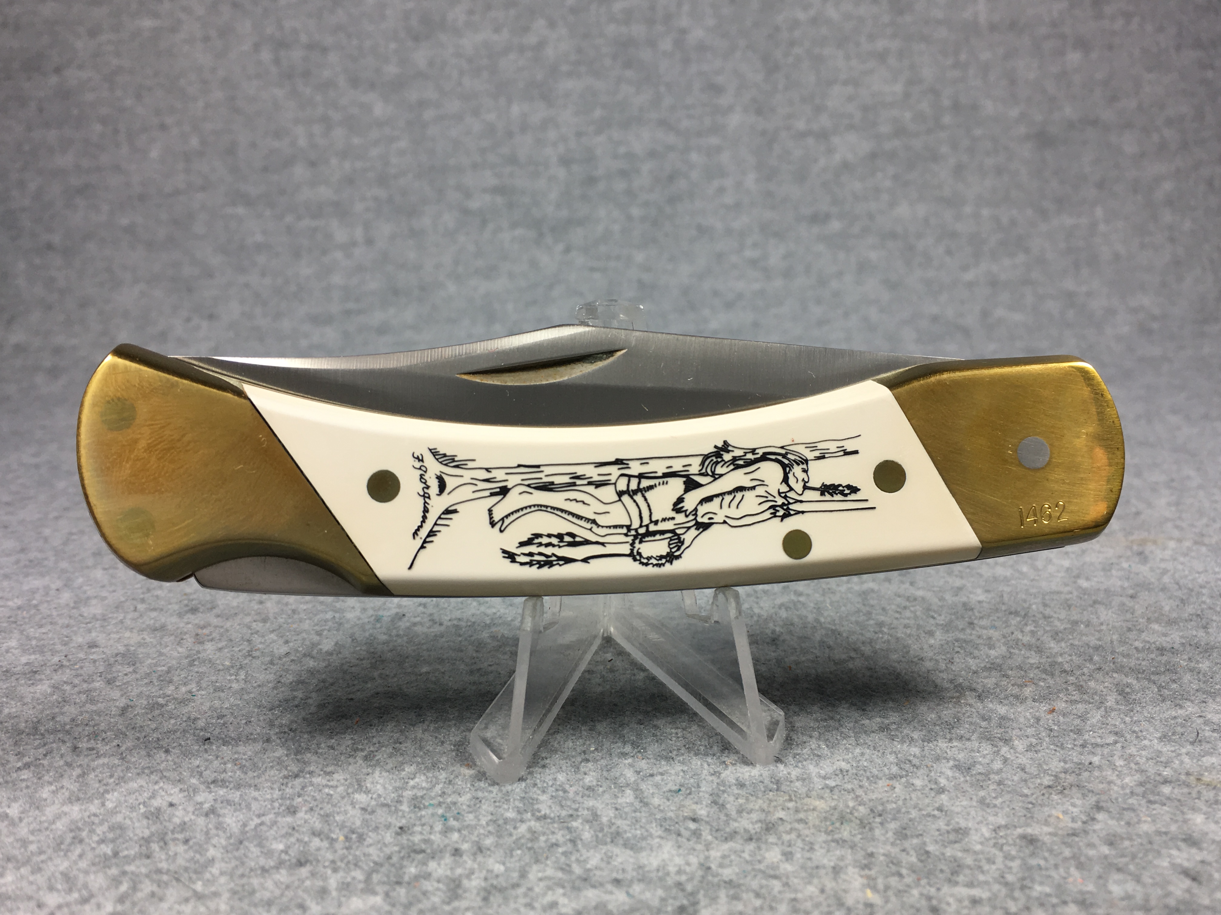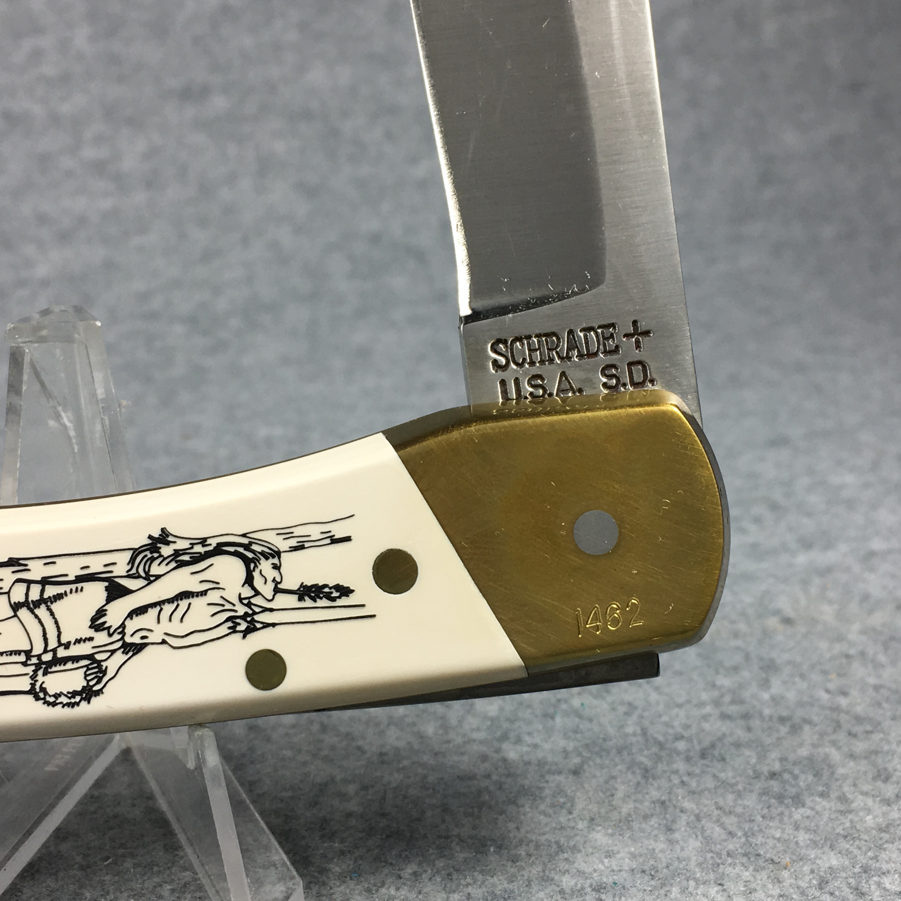 December 22, 2025 - Single Blade Limited Edition #1462 Lockblade Knife. 5  inches closed. 8-3/4 inches open. Made in USA. "SCHRADE+ U.S.A S.D. " tang stamp. Handle scrimshawed with Native American images. Brass bolsters. Front right bolster etched with serial #1462. Brass liner. With original box, paperwork, and beaded sheath.