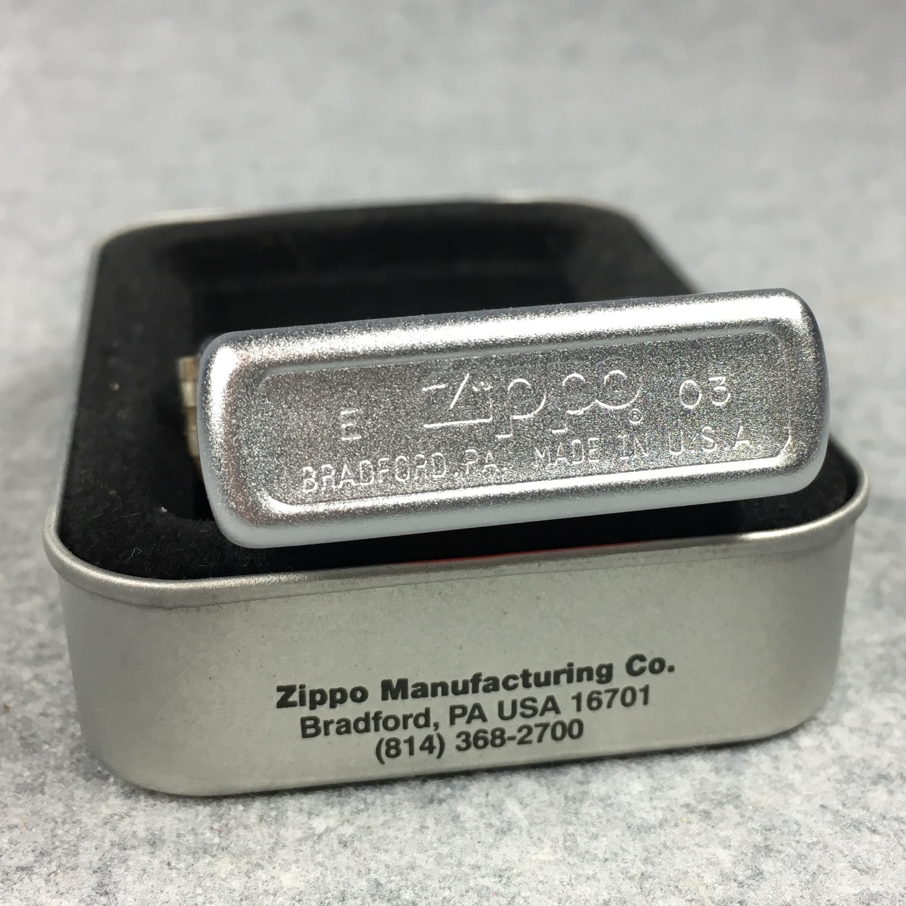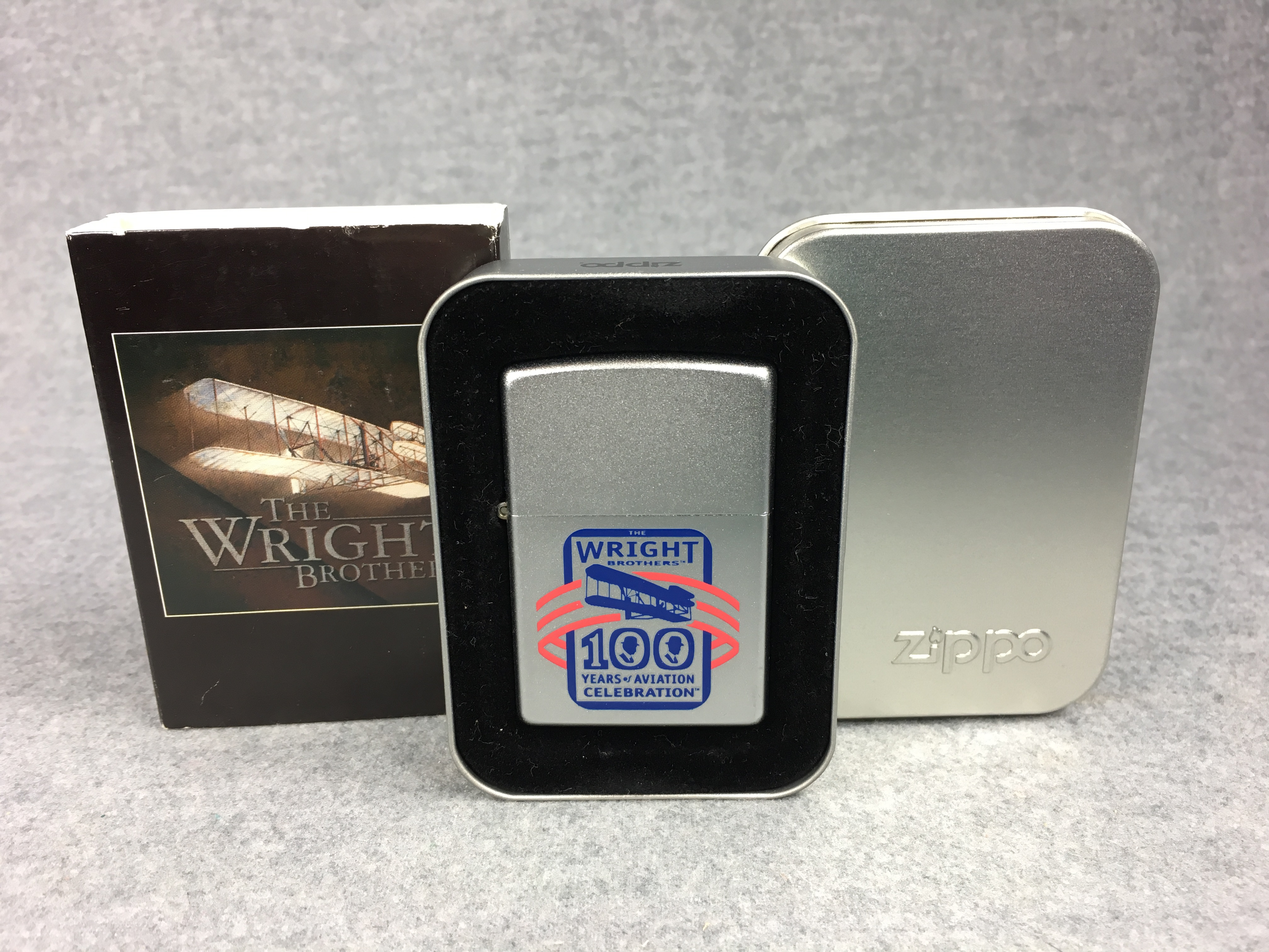 October 27, 2025 - ZIPPO WRIGHT BROTHERS 100 Years of Aviation Lighter manufactured in 2003. Satin Chrome finish over solid Brass with front color design. Standard size 1-7/16 inches wide by 2-1/4 inches high. Bottom of lighter reads: E Zippo 03 Bradford, PA. Made in U.S.A. Sealed, new in tin, includes original, unfired insert.