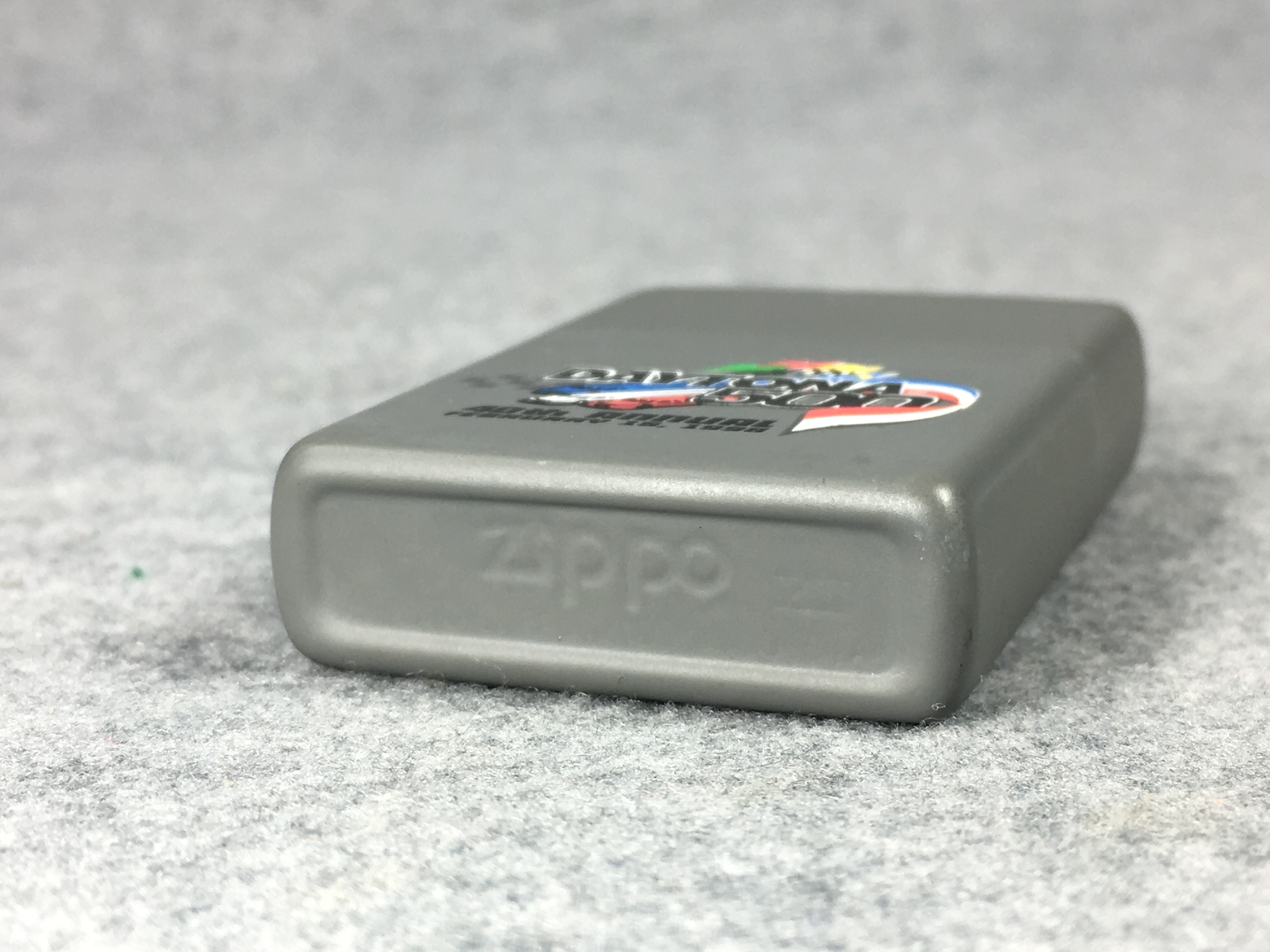 April 03, 2026 - ZIPPO 40TH ANNUAL DAYTONA 500 Feb 15, 1998 Lighter manufactured in 1995. Matte gray finish over solid Brass with color printed front design. Standard size 1-7/16 inches wide by 2-1/4 inches high. Bottom of lighter reads: F Zippo XI Bradford, PA. Made in U.S.A. Sealed with original, unfired insert. No box.