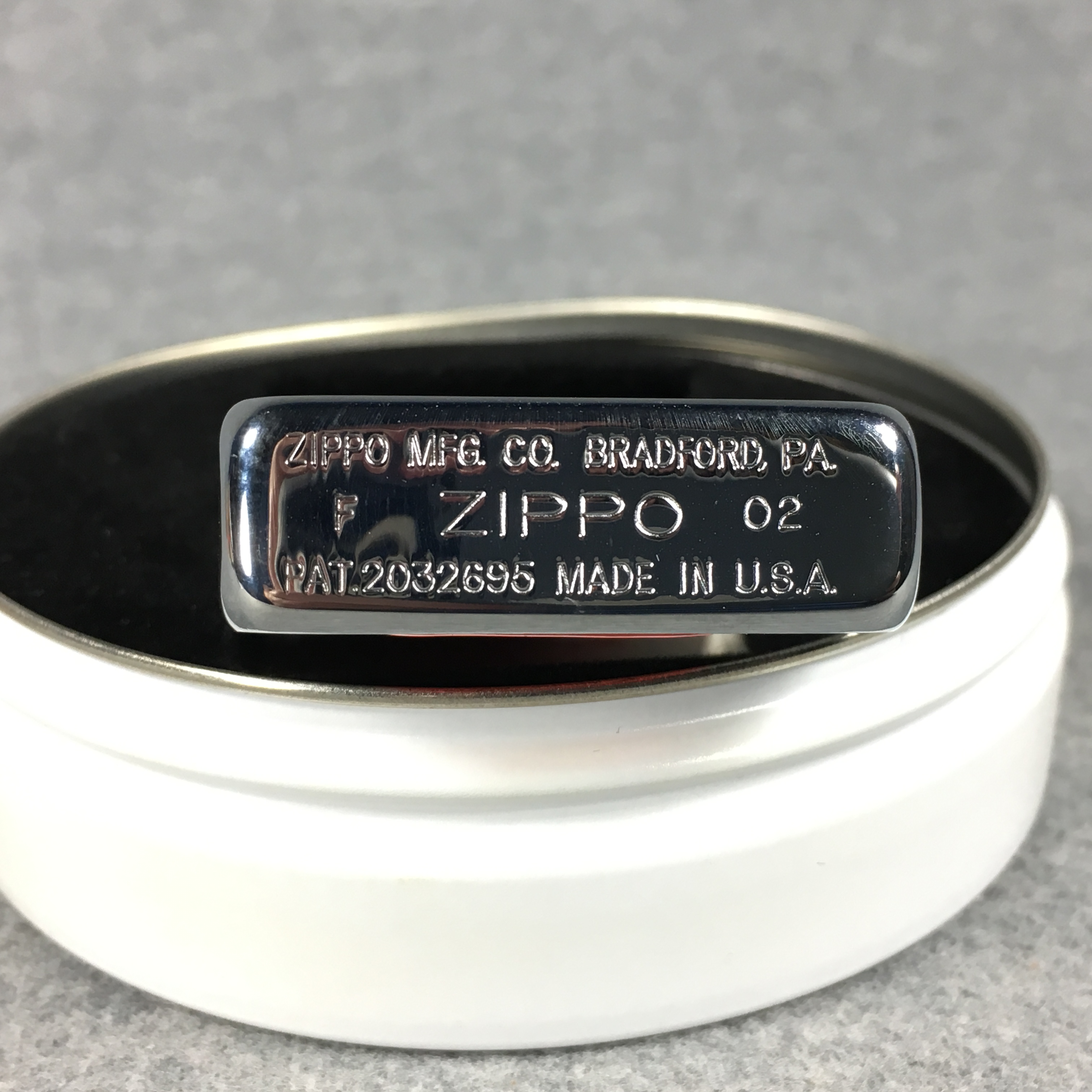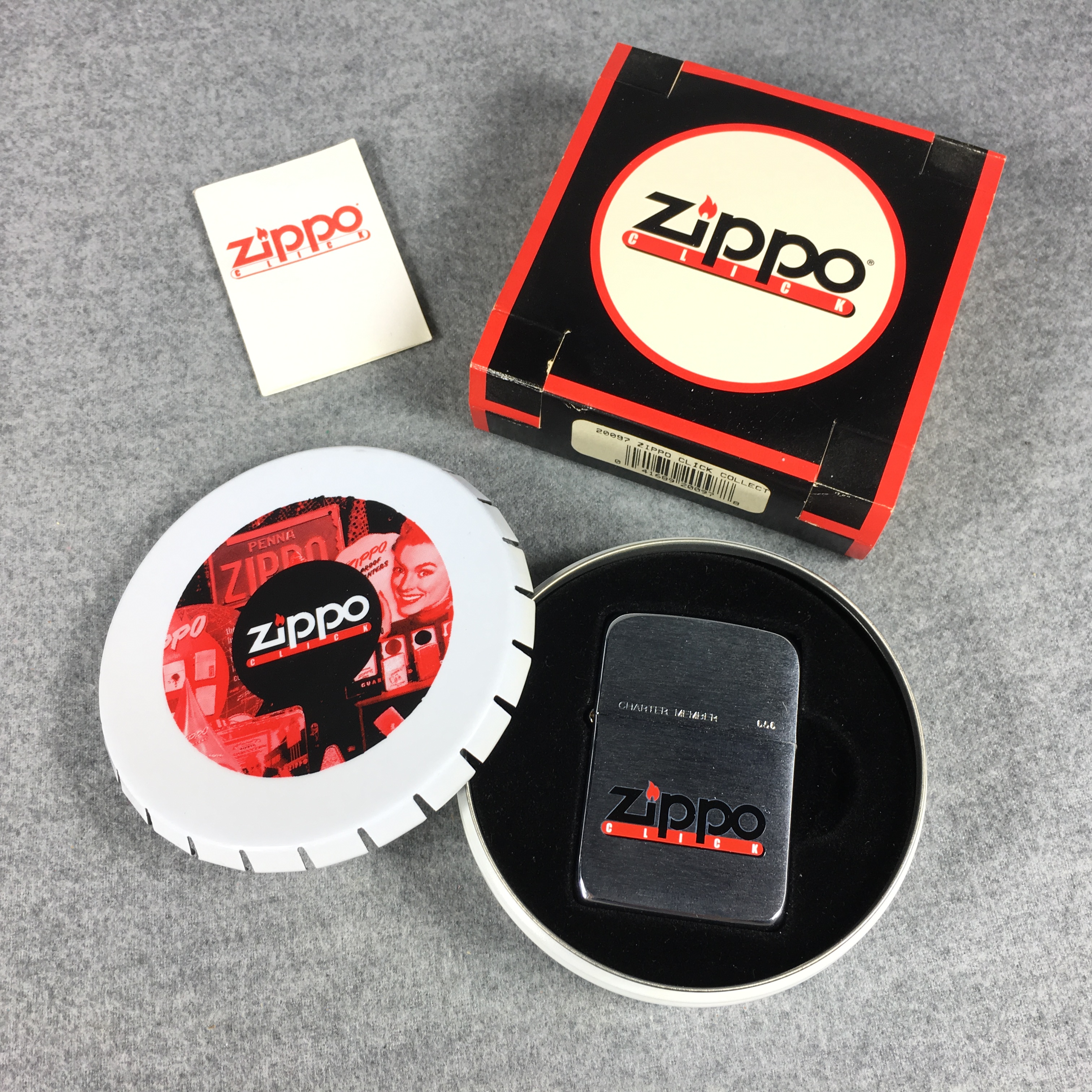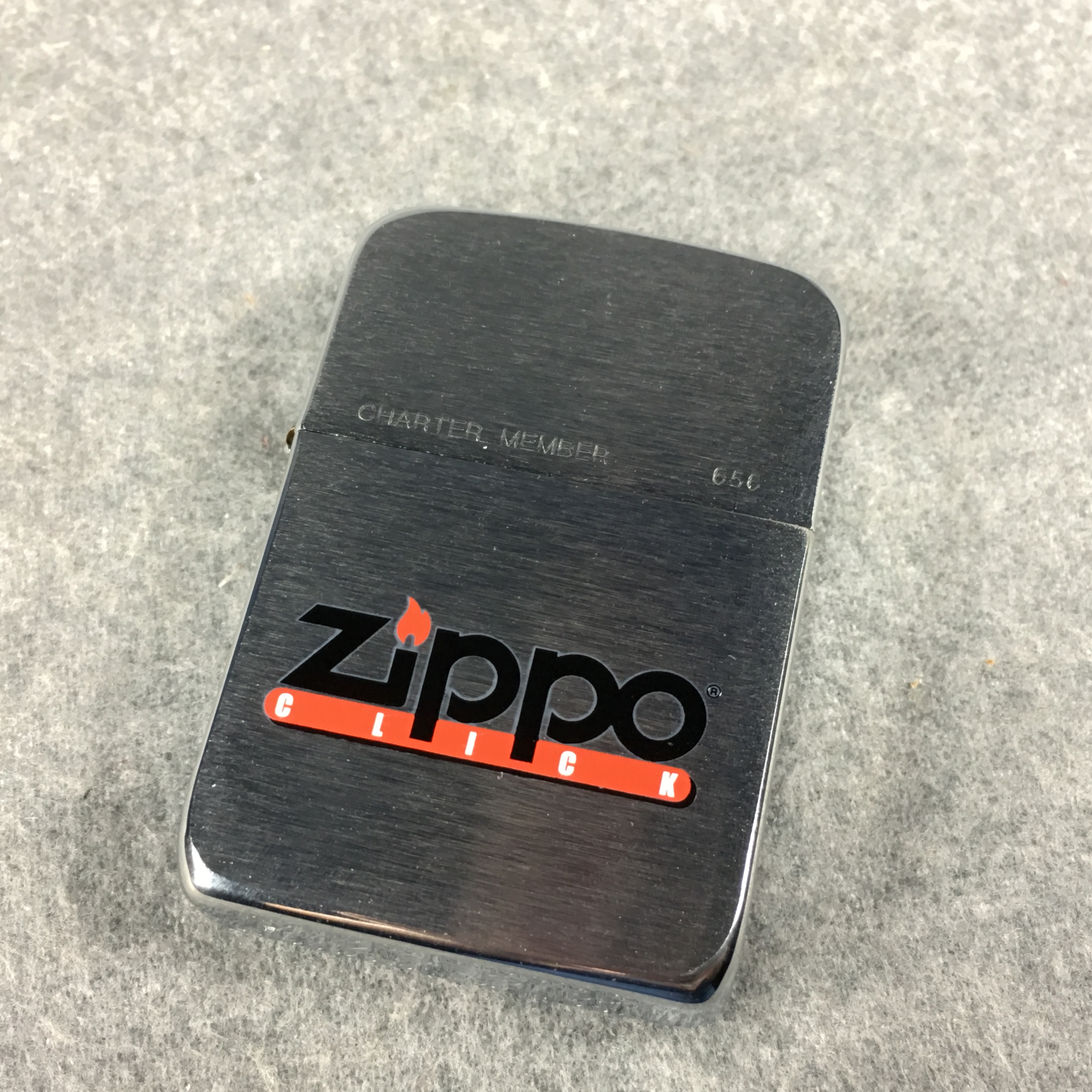 February 09, 2026 - ZIPPO CLICK CHARTER MEMBER Lighter. Brushed chrome finish over solid brass with color printed front design. Front of lid etched "CHARTER MEMBER" with serial #656. Standard size 1-7/16 inches wide by 2-1/4 inches high. Bottom of lighter reads: ZIPPO MFG. CO. BRADFORD, PA. F Zippo 02  PAT.2032695  Made in U.S.A. New in tin, sealed, collectors case, paperwork, and sleeve.