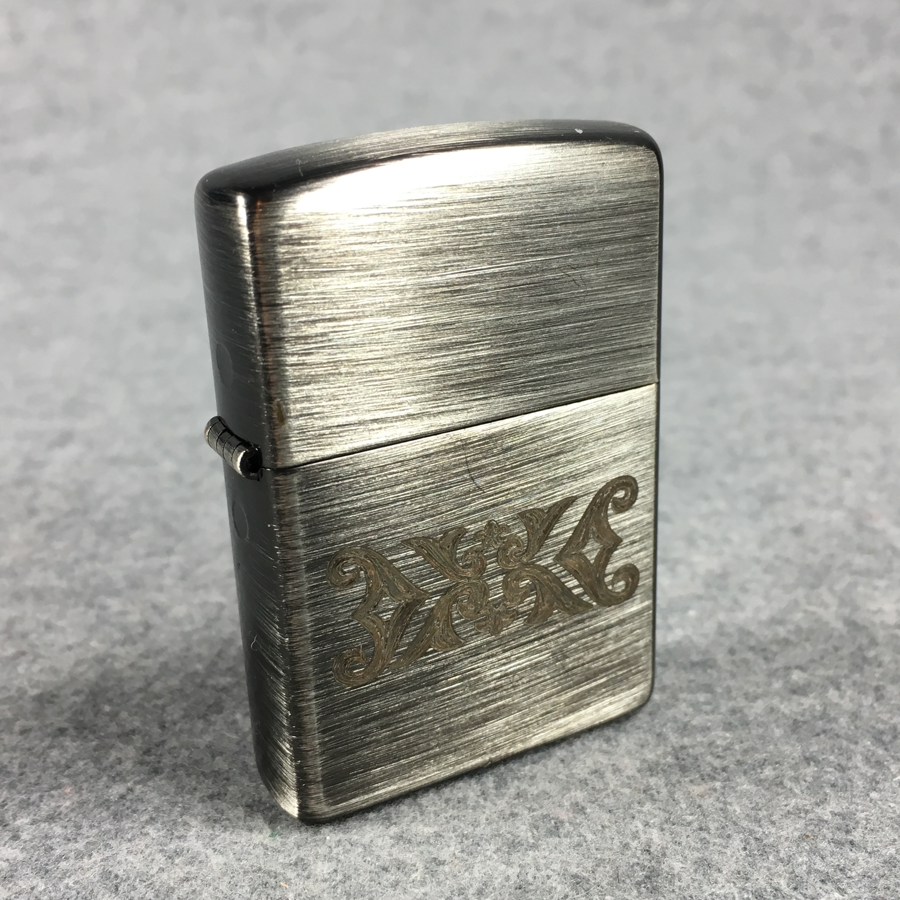 You have: FRONT LASER ETCHED SCROLL Gray Brushed Chrome Lighter (Zippo, 2006)