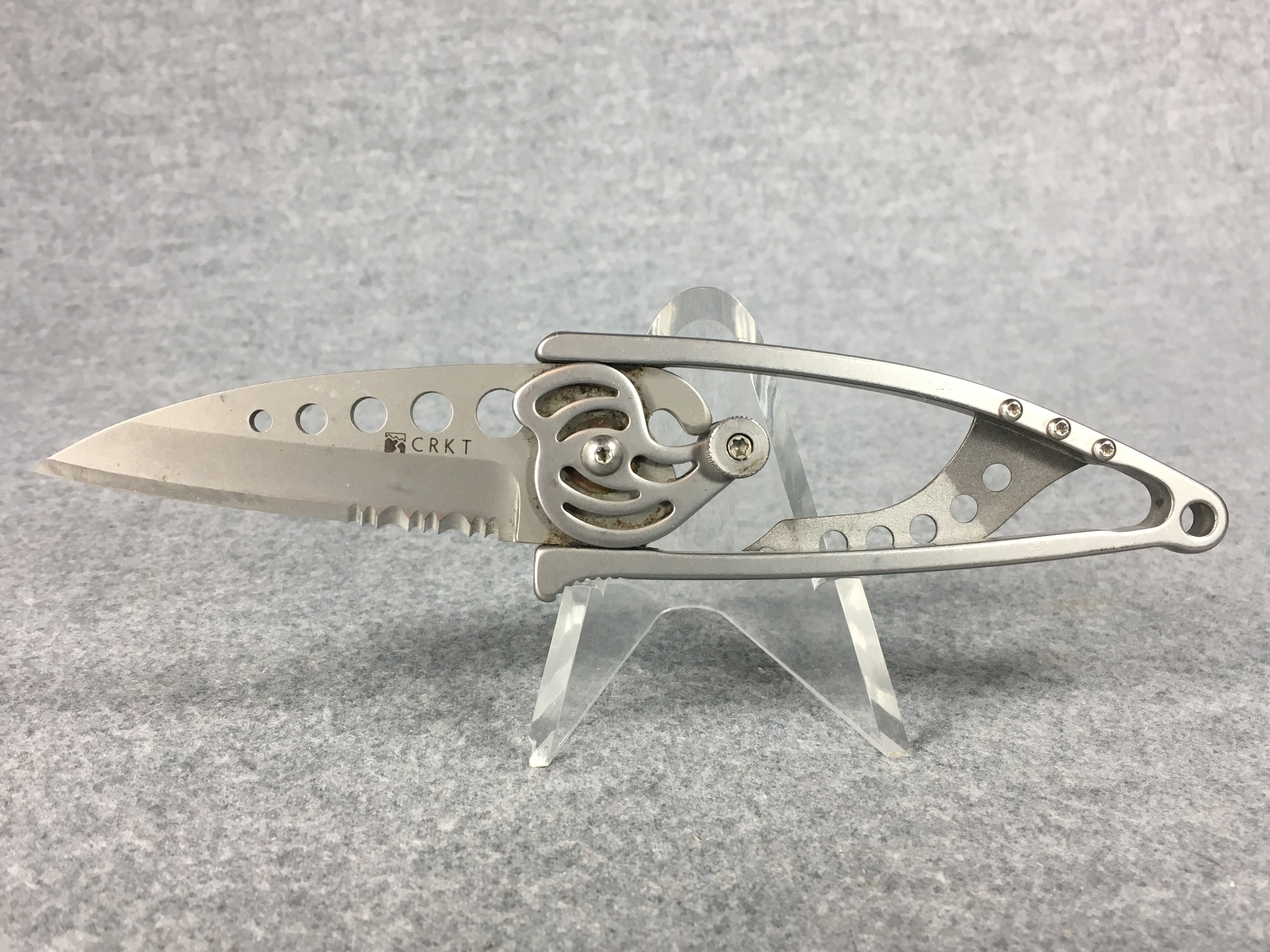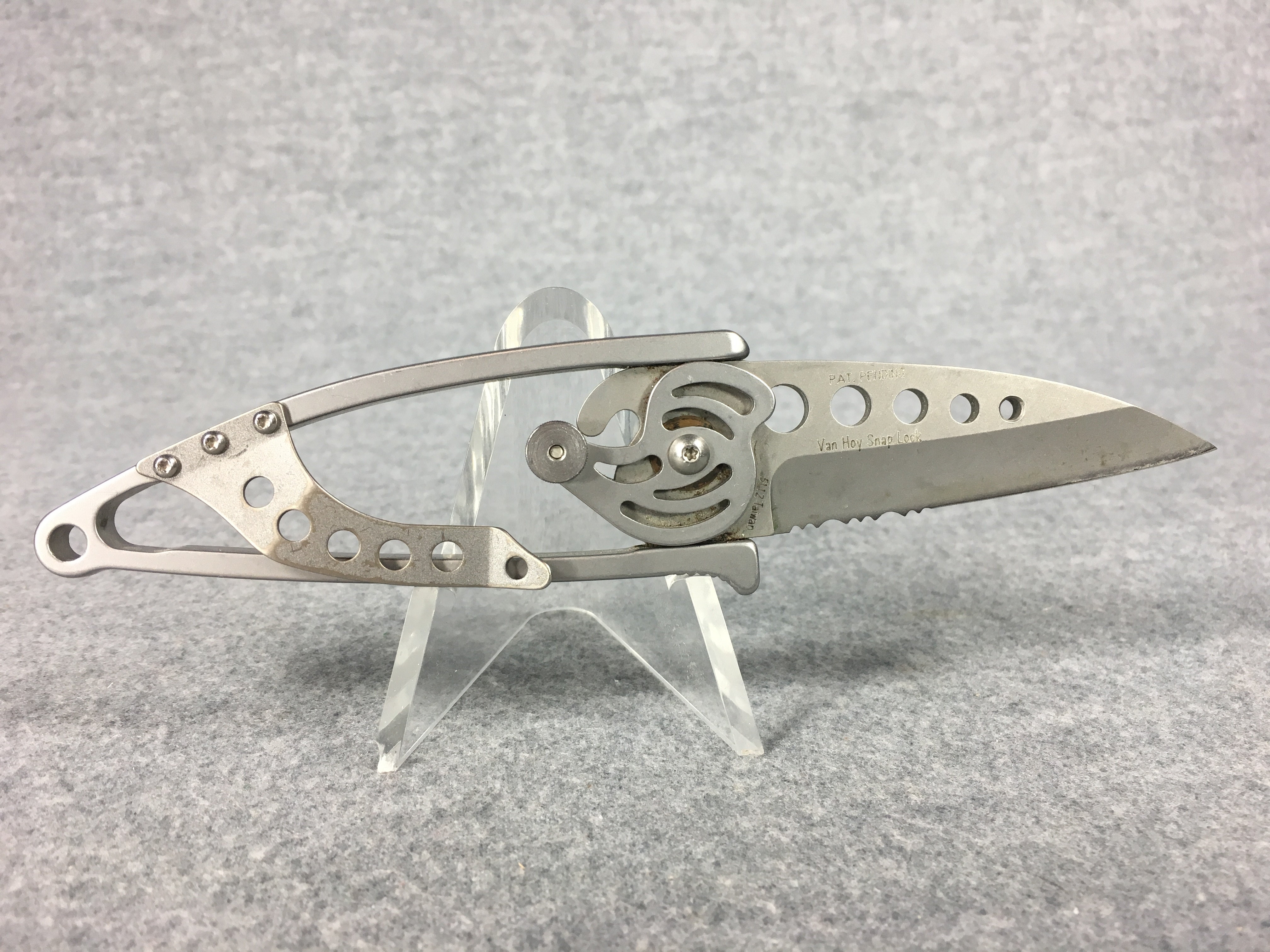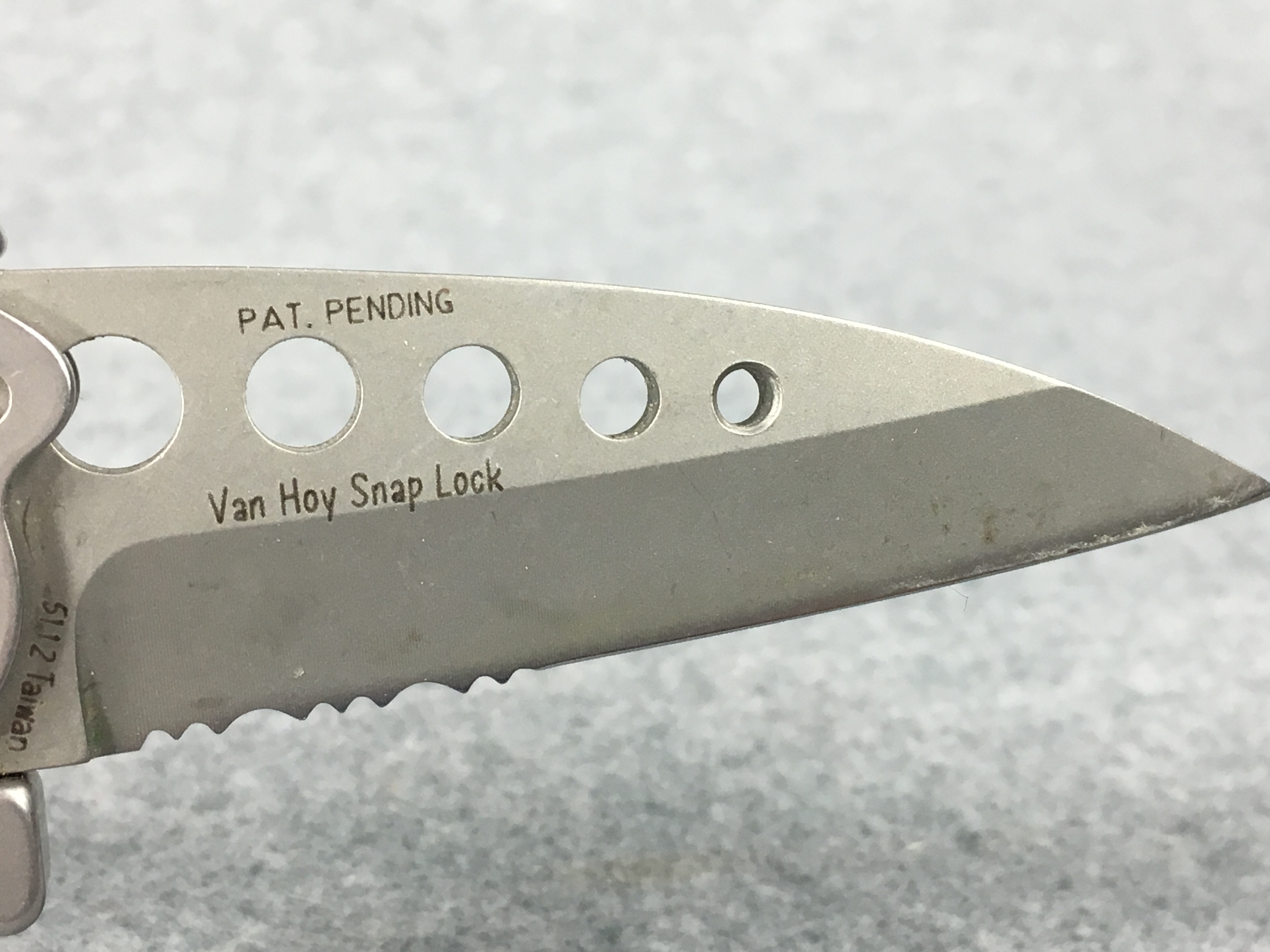 January 08, 2026 - 4-1/4 inches closed. 6-1/4 inches open. "5112 Taiwan" tang stamp. 420J2 stainless steel handles. 420J2 stainless steel, plain edge, drop point, bead blast finish blade. Blade stamped "CRKT" with logo and "Van Hoy Snap Lock PAT. PENDING". Knife has pocket clip and lanyard hole. No box.