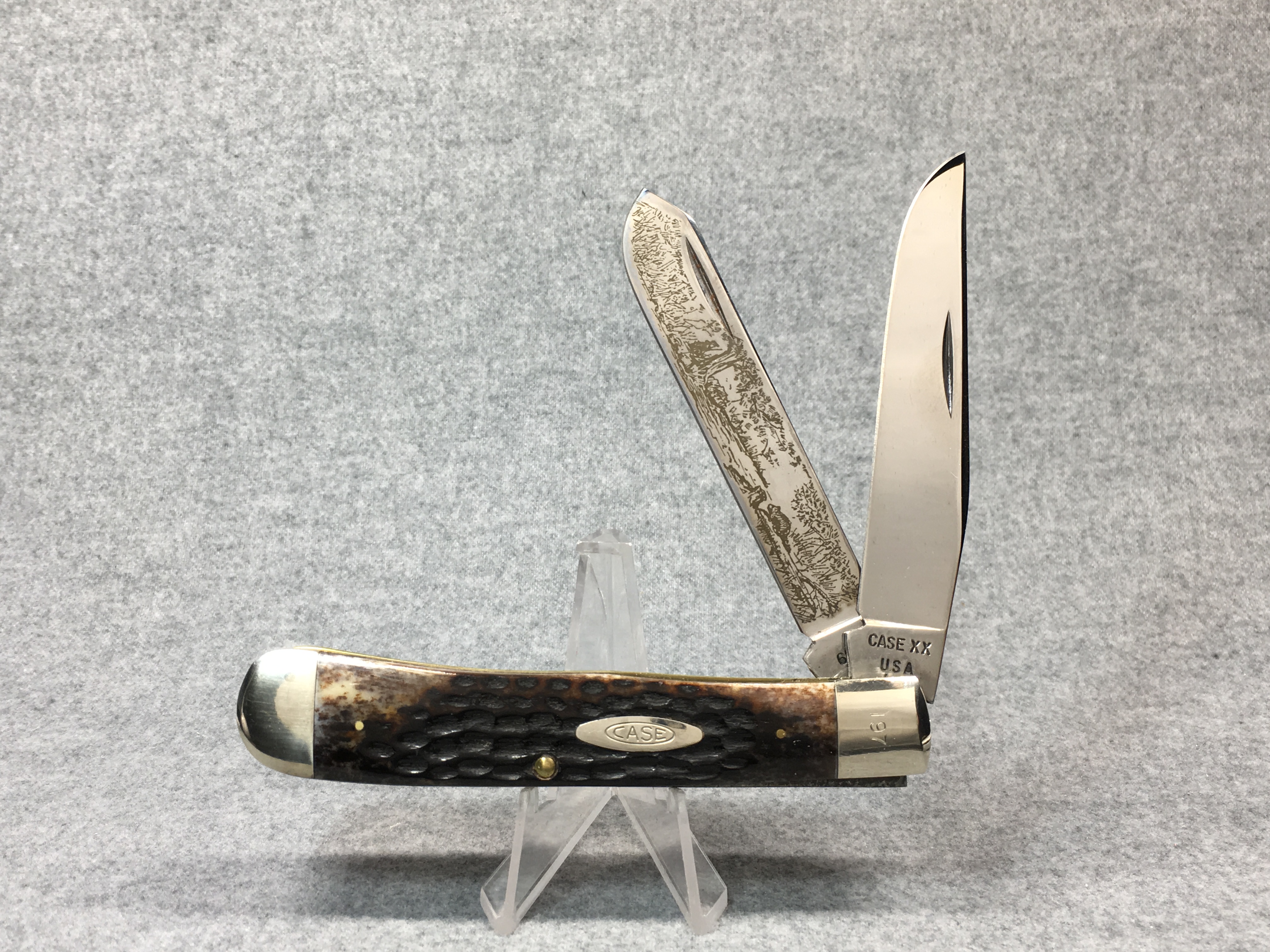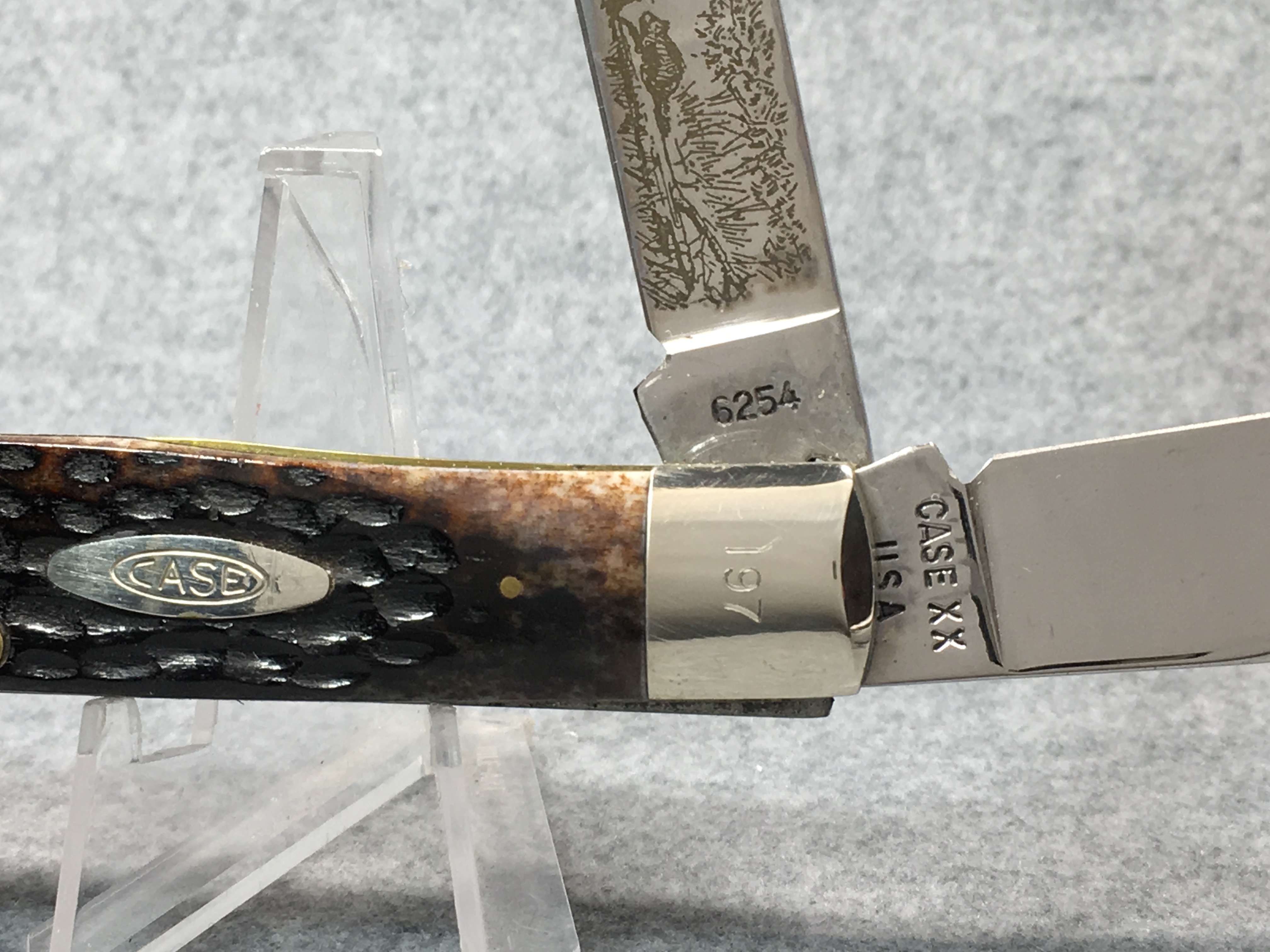 December 22, 2025 - Limited Edition of 600 Smoky Mountain Knife Works 1 from the set of 3 trapper knives. 2-Blades. 4-1/8 inches closed. 7-3/8 inches open. Made in USA. "CASE XX U.S.A. *  * " (2 dot) and "6254" tang stamps. Double oval 'open C' CASE shield. Chrome vanadium blades. One blade etched with a forest scene with a hunter and a raccoon. Brown jigged bone handle. Nickel Silver bolsters and brass liner. Front right bolster etched with serial