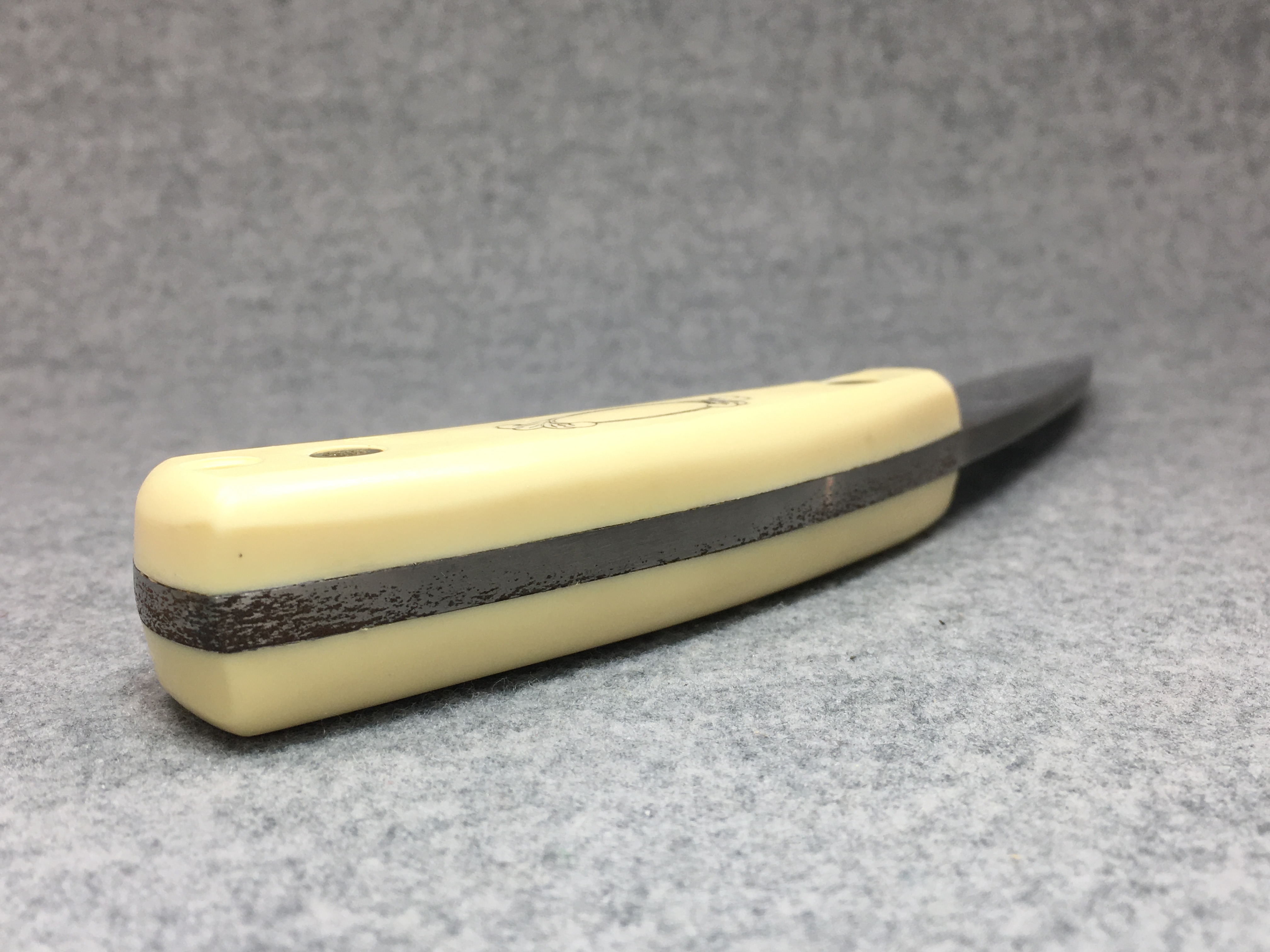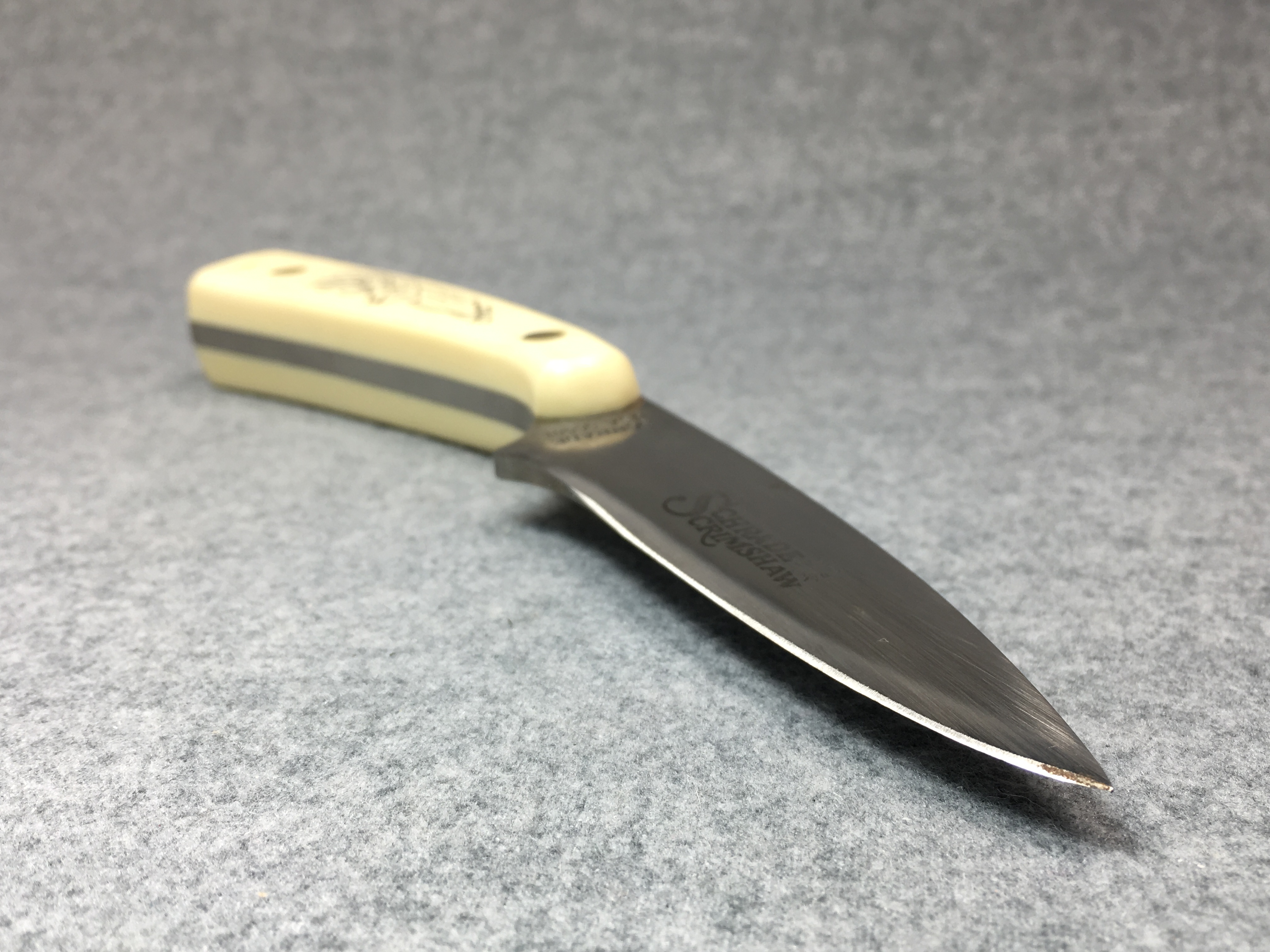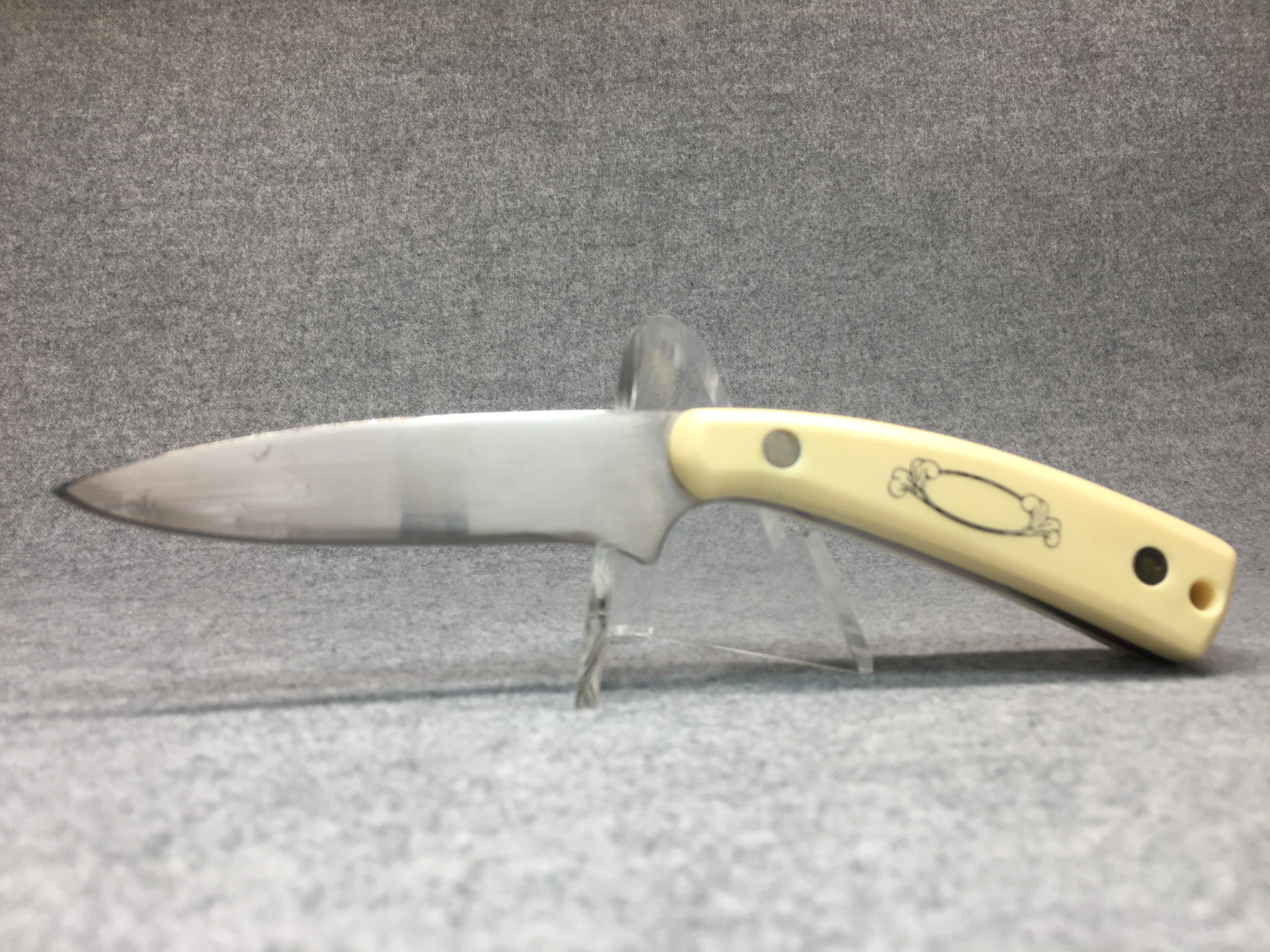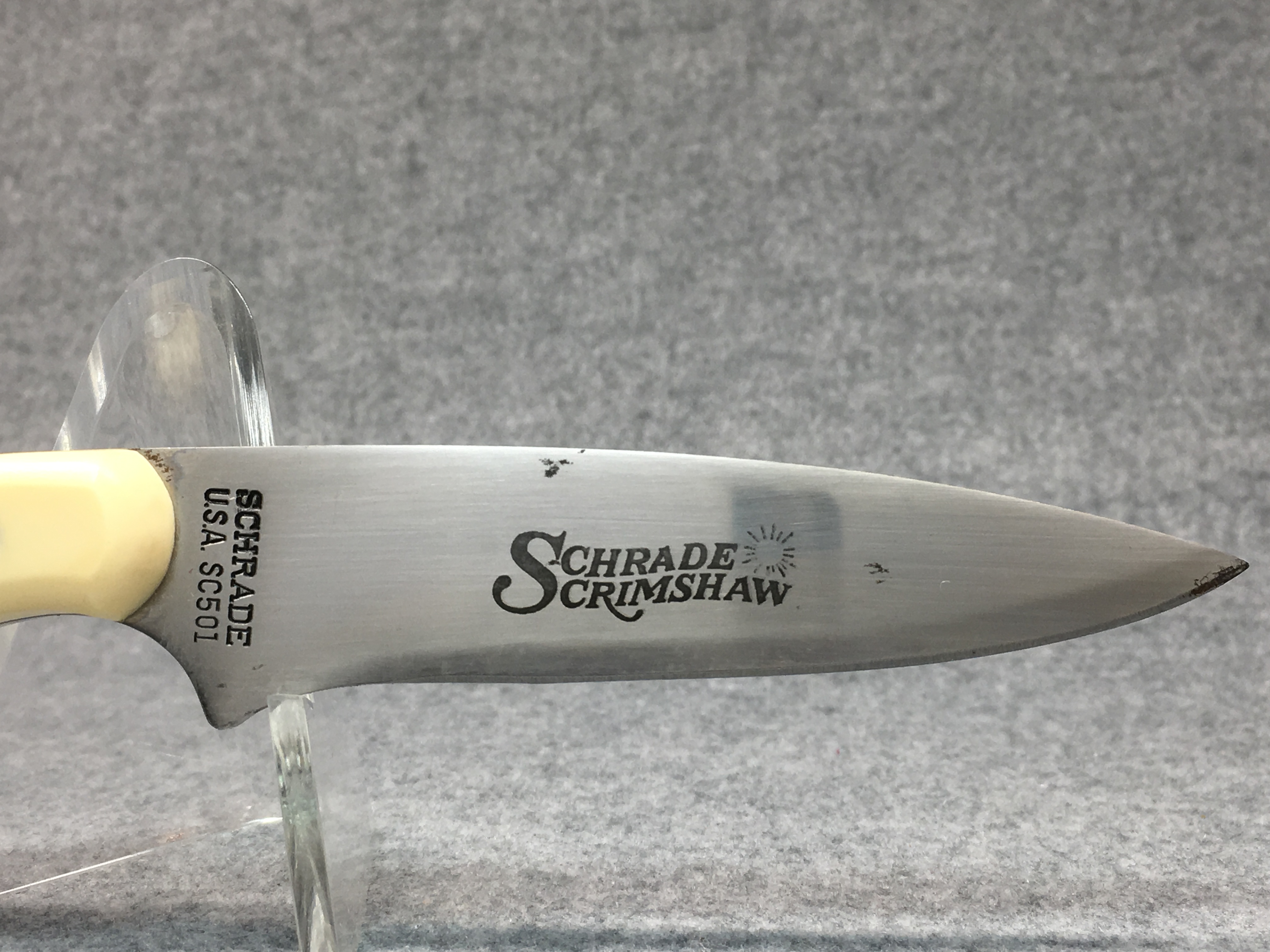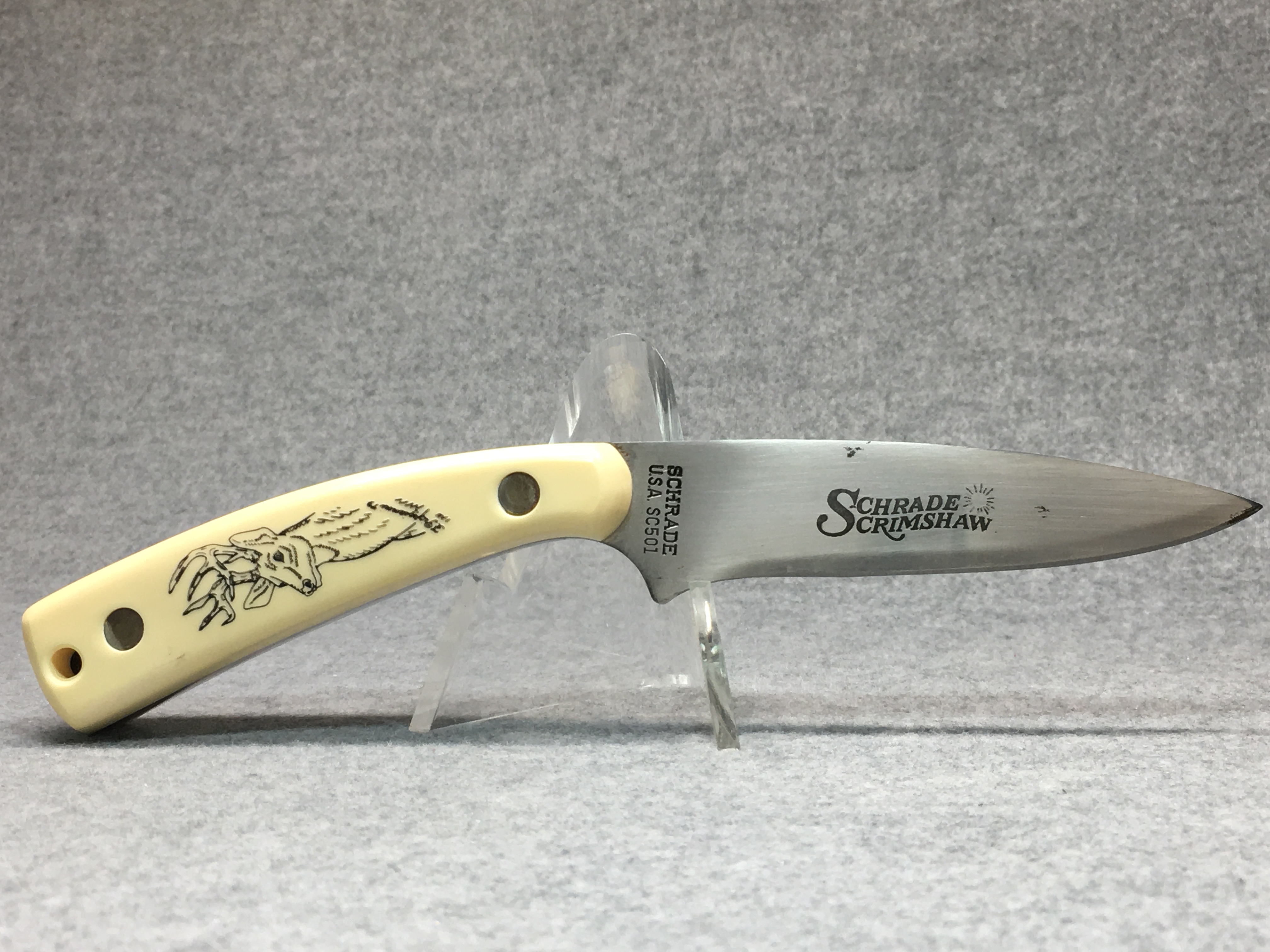 December 22, 2025 - Fixed-Blade Knife. 7-1/4 inches long. Made in USA. "SCHRADE U.S.A. SC501" tang stamp. Stainless Steel blade etched "Schrade Scrimshaw". Whale tooth delrin handle scrimshawed with image of a pronghorn. No box.