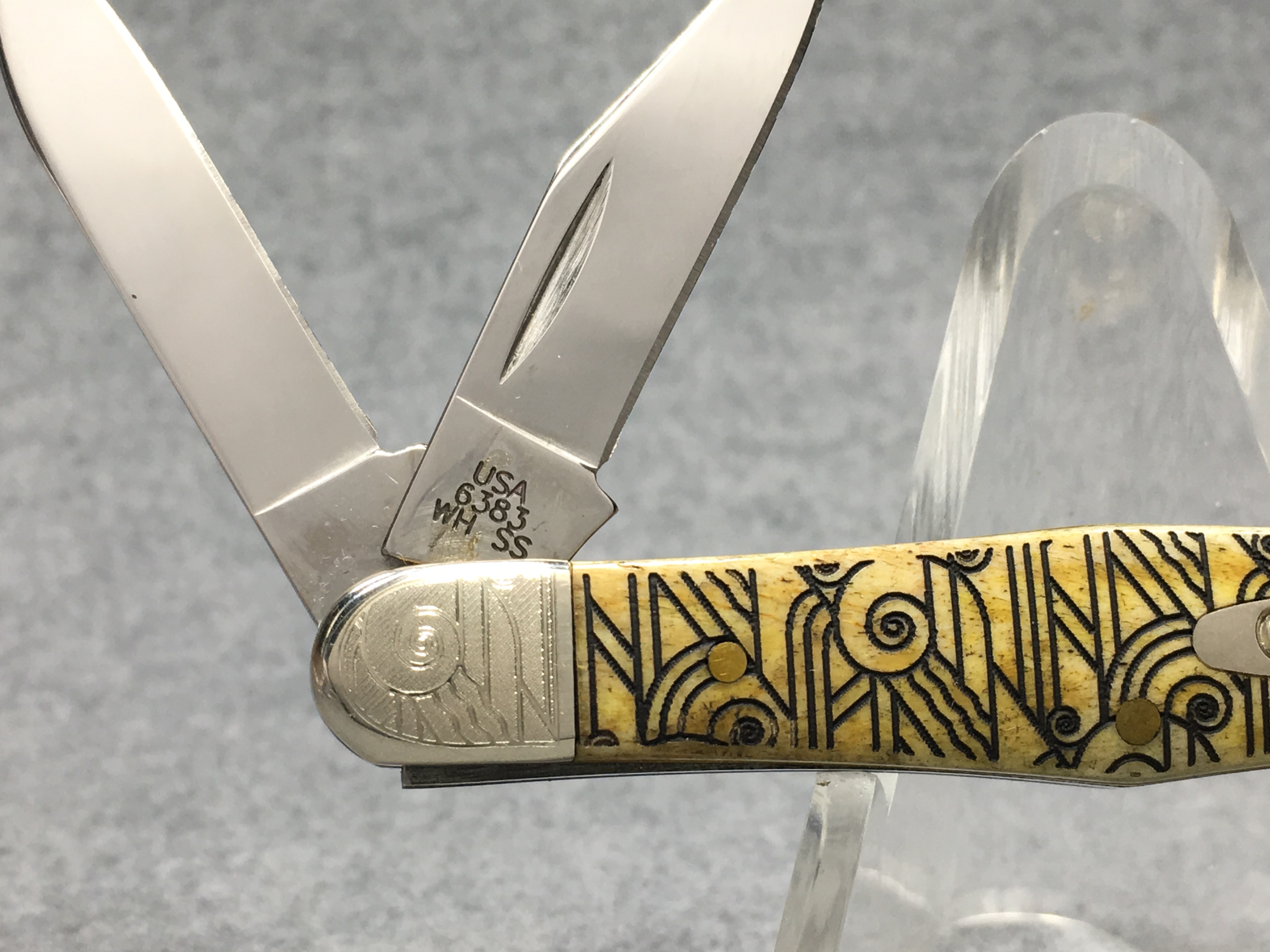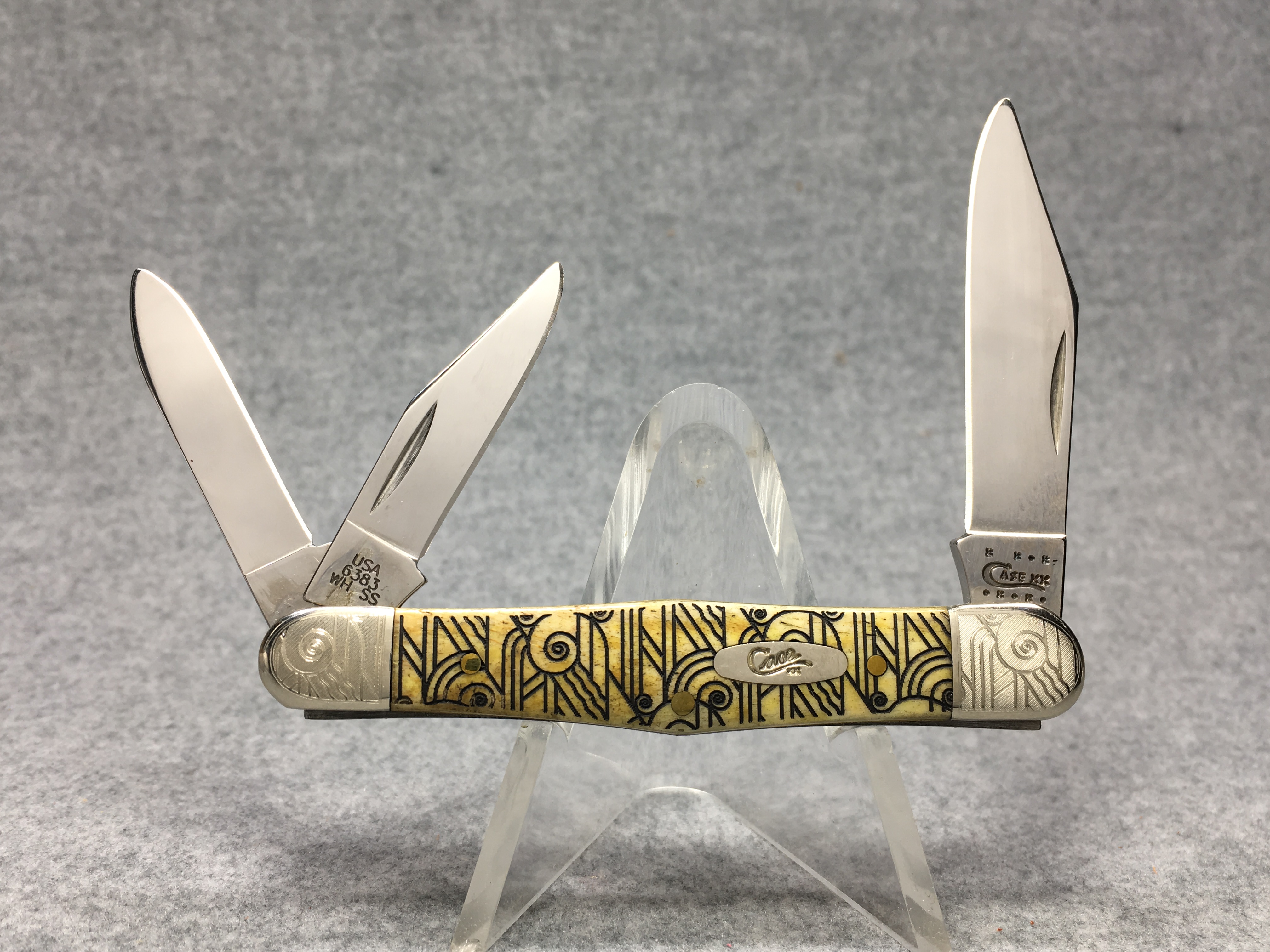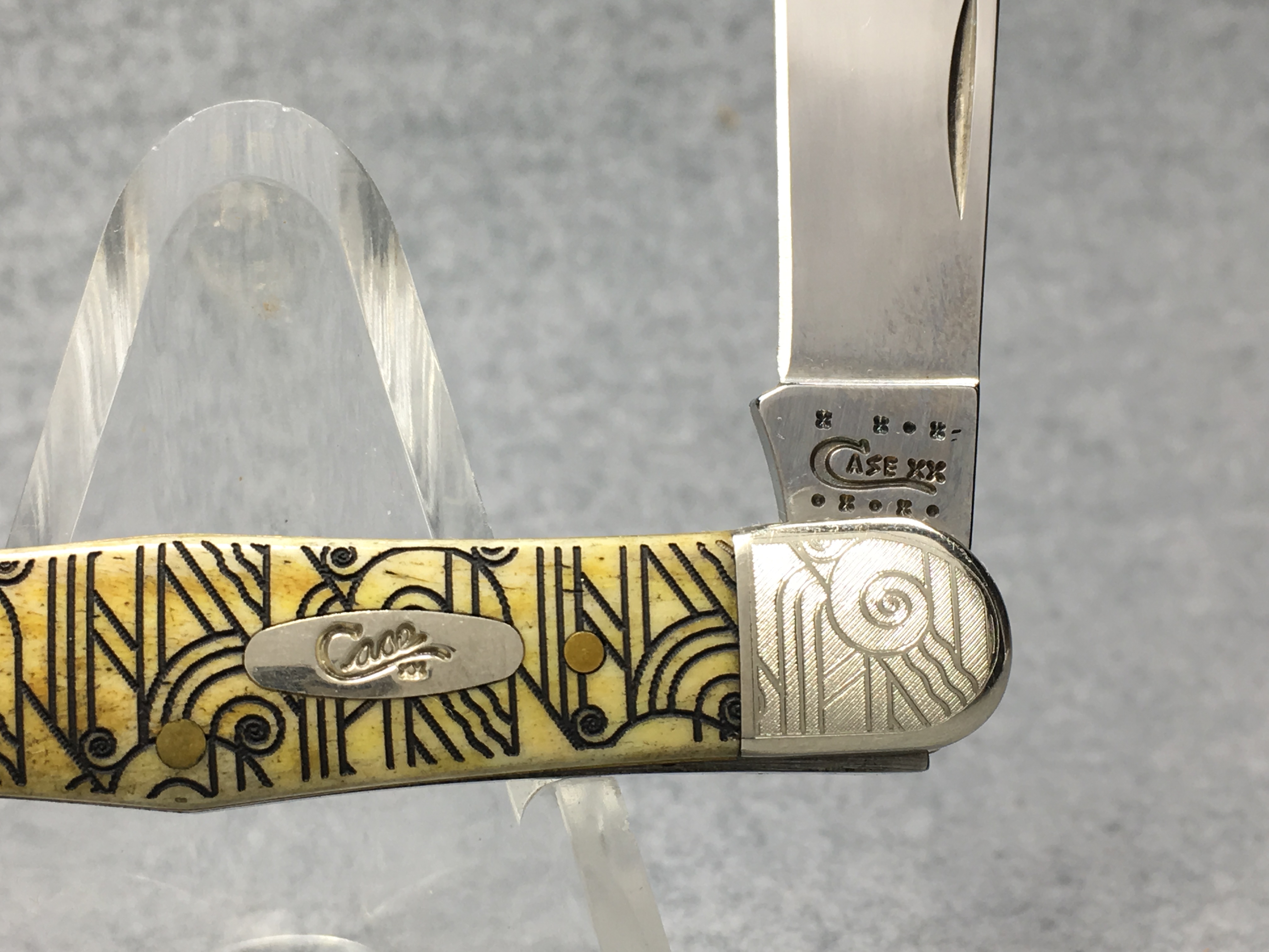 March 09, 2026 - 3-1/2 inches closed. 5-3/4 inches open. Made in USA. " x x*x  CASE XX  *x*x*  " (with lightning bolt S) and "6383 WH SS" tang stamps. Oval long-C script "Case xx" shield. Stainless steel blades. Art deco laser etched smooth bone handle. Nickel Silver etched bolsters. Brass liner.