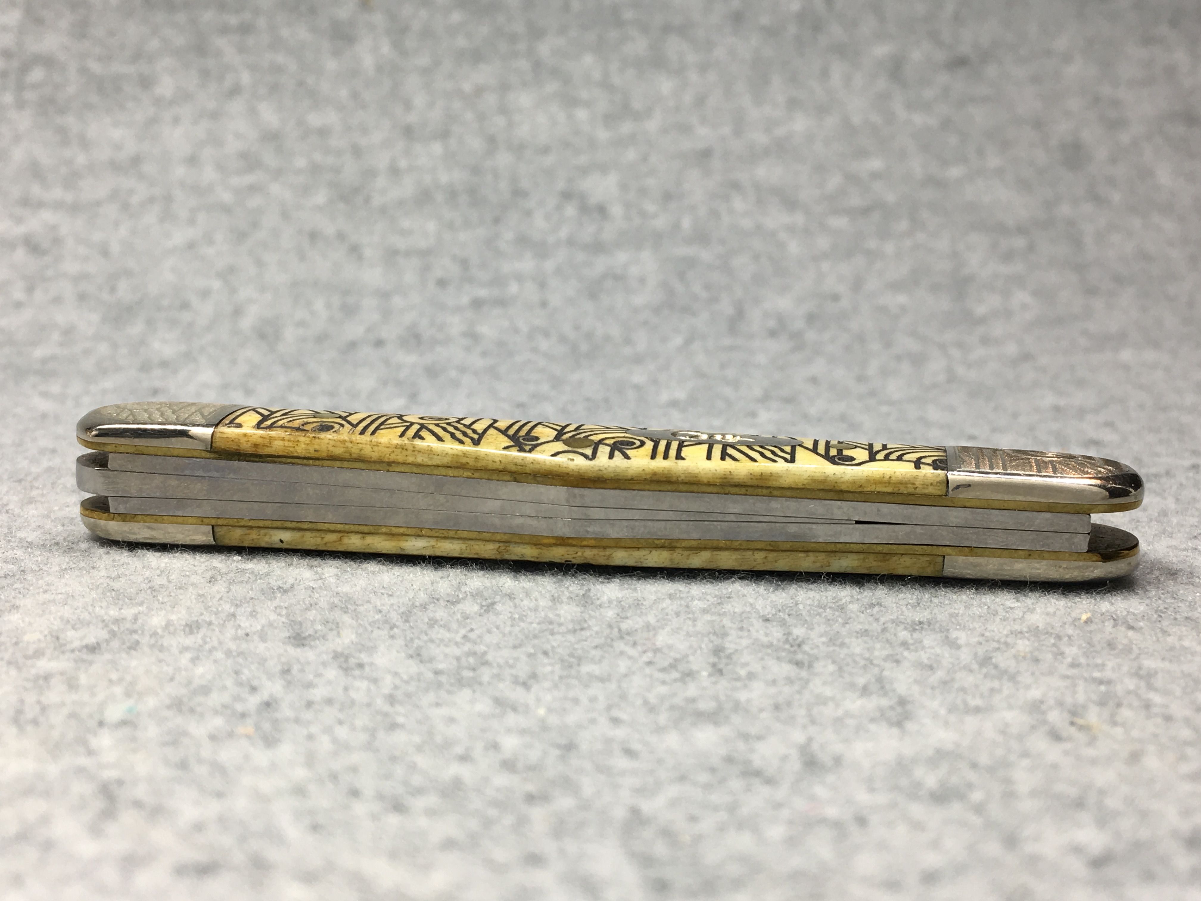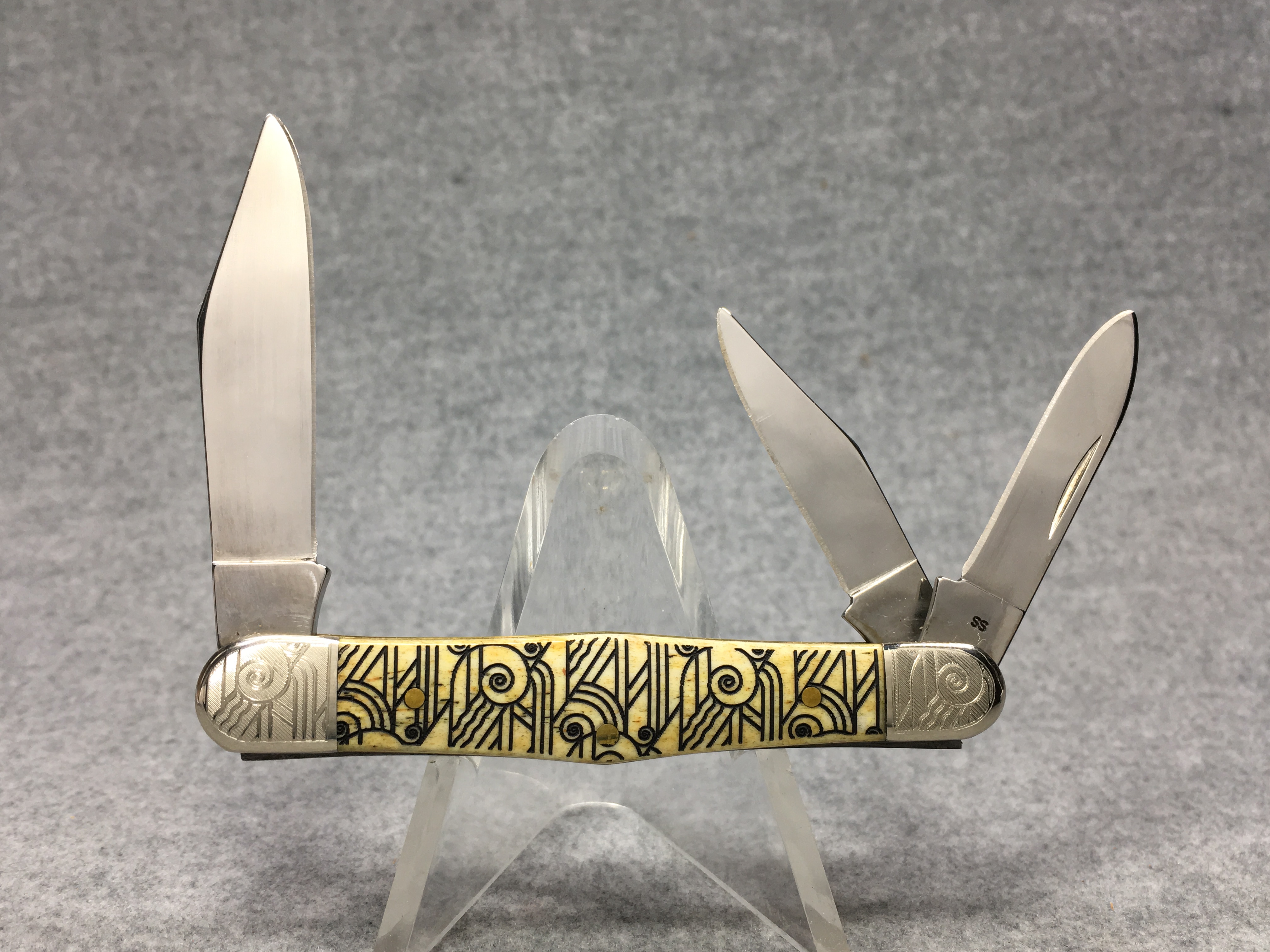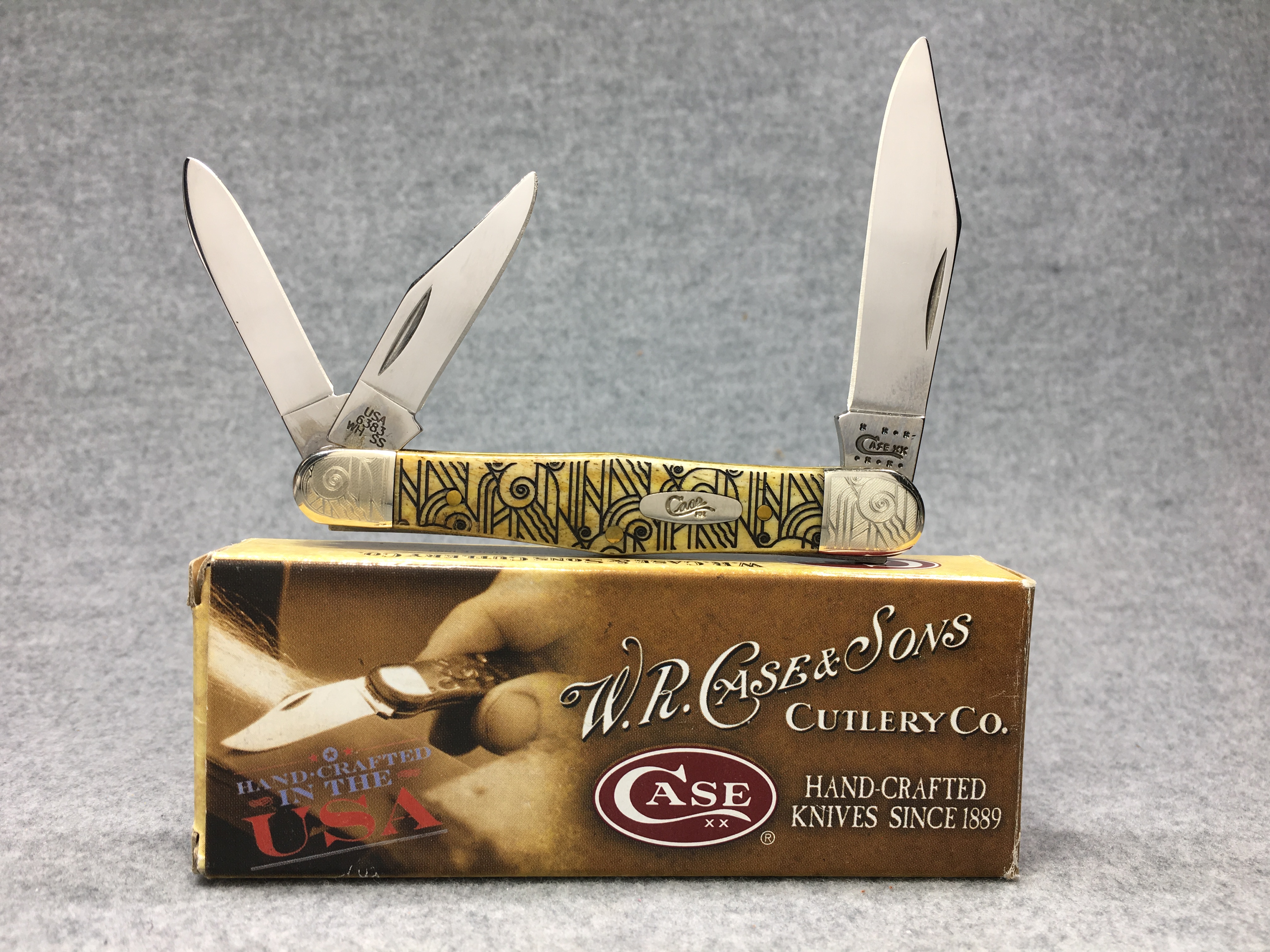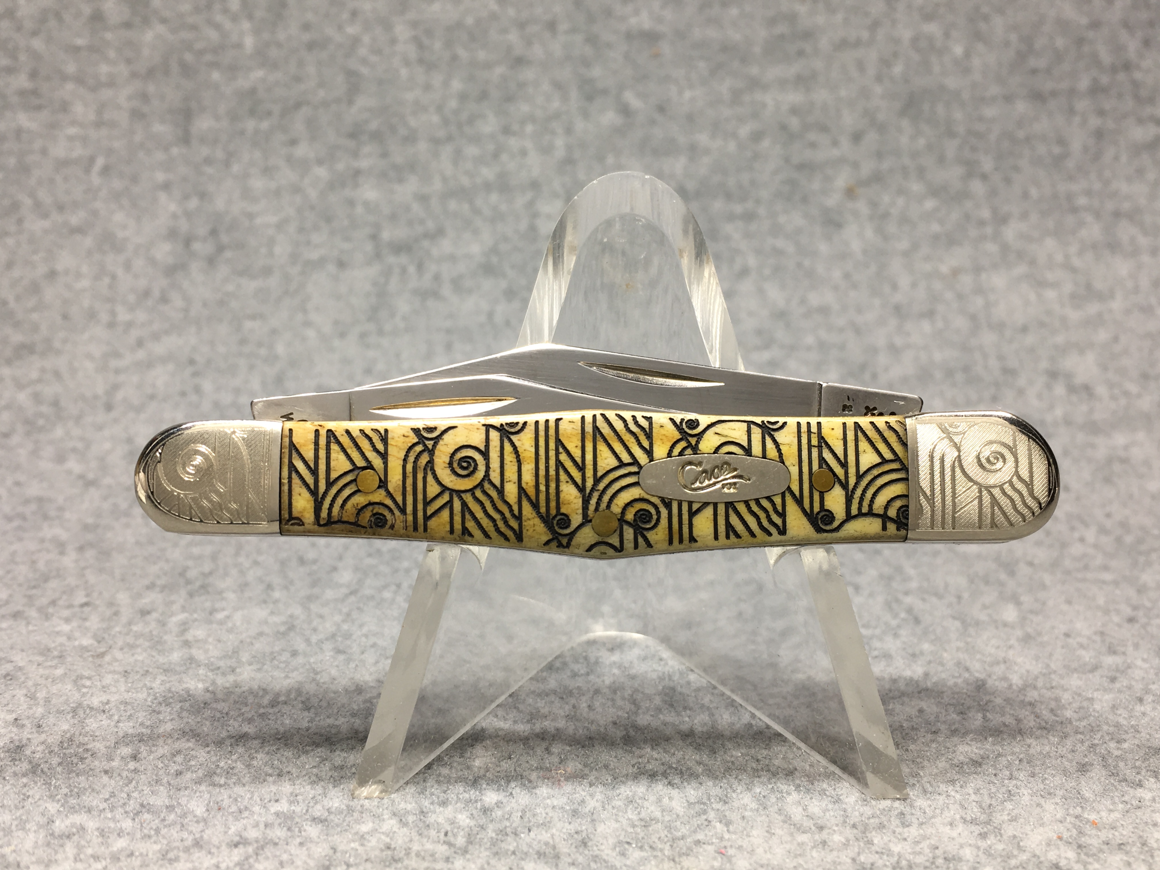 March 09, 2026 - 3-1/2 inches closed. 5-3/4 inches open. Made in USA. " x x*x  CASE XX  *x*x*  " (with lightning bolt S) and "6383 WH SS" tang stamps. Oval long-C script "Case xx" shield. Stainless steel blades. Art deco laser etched smooth bone handle. Nickel Silver etched bolsters. Brass liner.