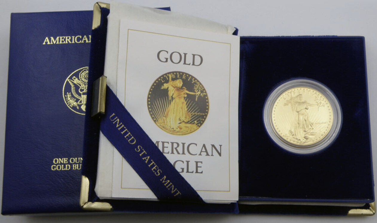 November 04, 2025 - This is the first year for the gold American Eagle coins from the U.S. Mint. Mintage: 446,290. OGP = original government packaging. One ounce ($50) American Eagle Proof has the West Point mint mark. Housed in the original velvet display case and with the dark blue outer box. Original Certificate of Authenticity is intact. The coin weighs 33.93 grams and is made of 91.6% gold, for a net bullion value of one troy ounce (31.1 grams) of pure gold.