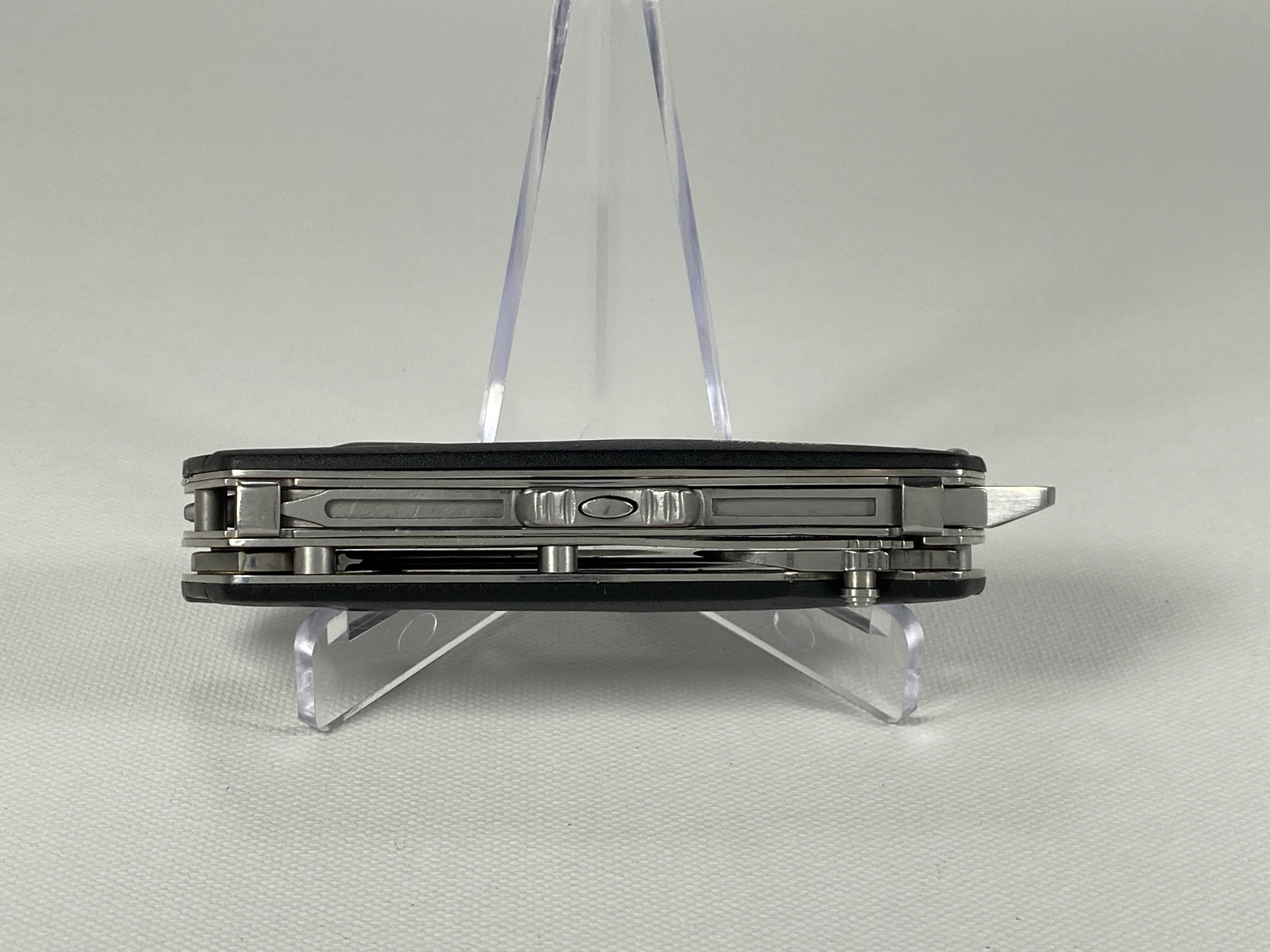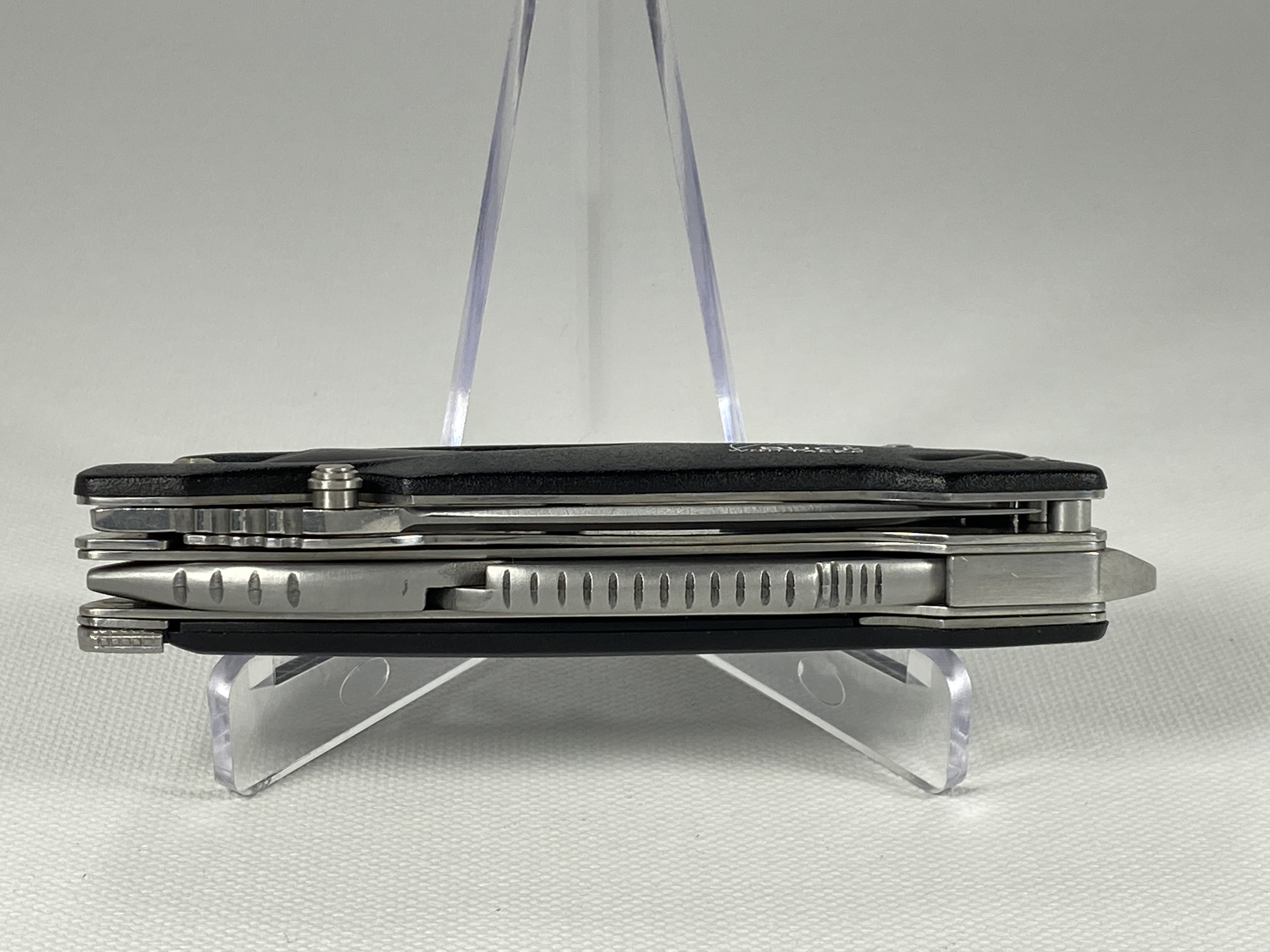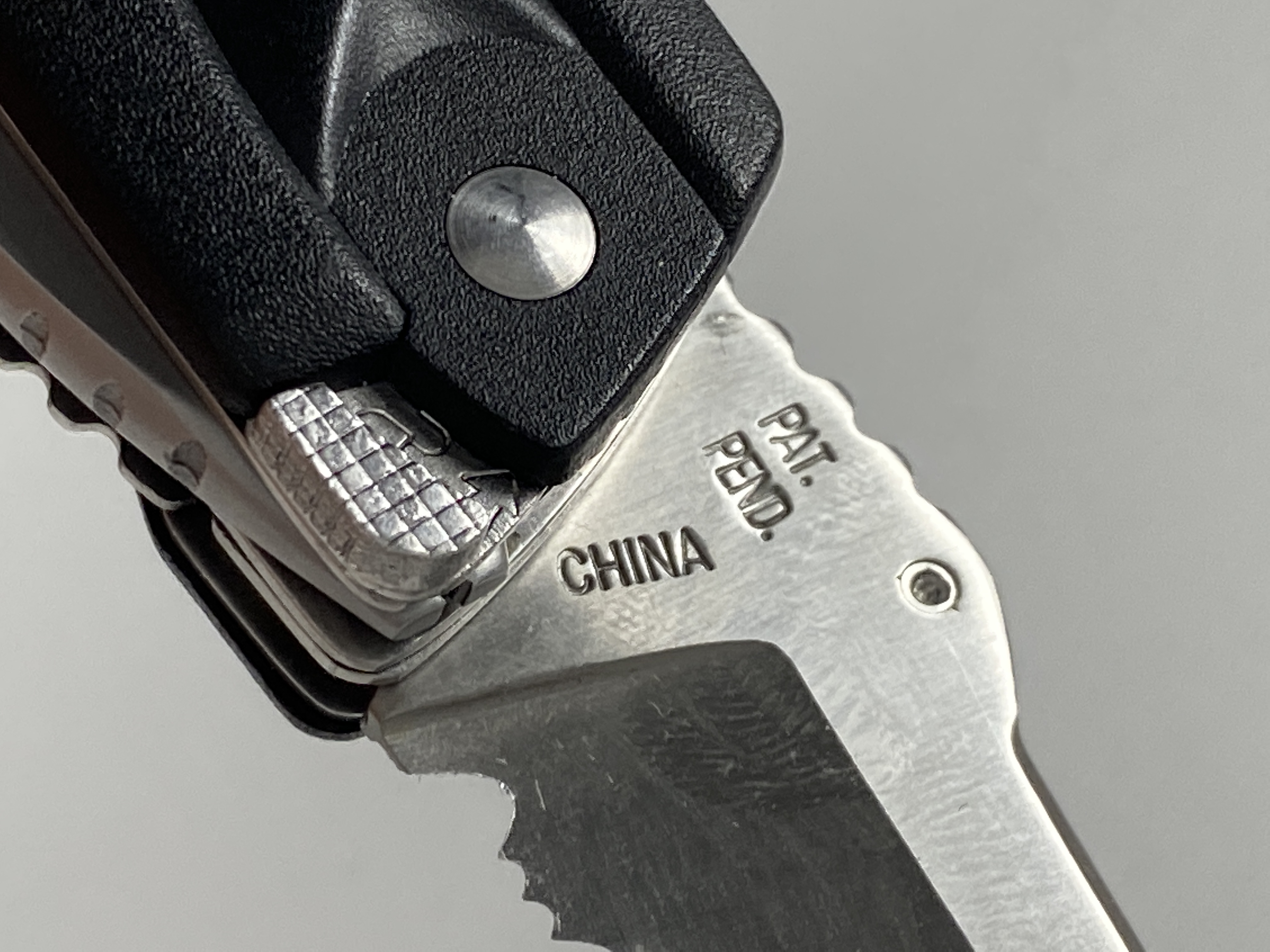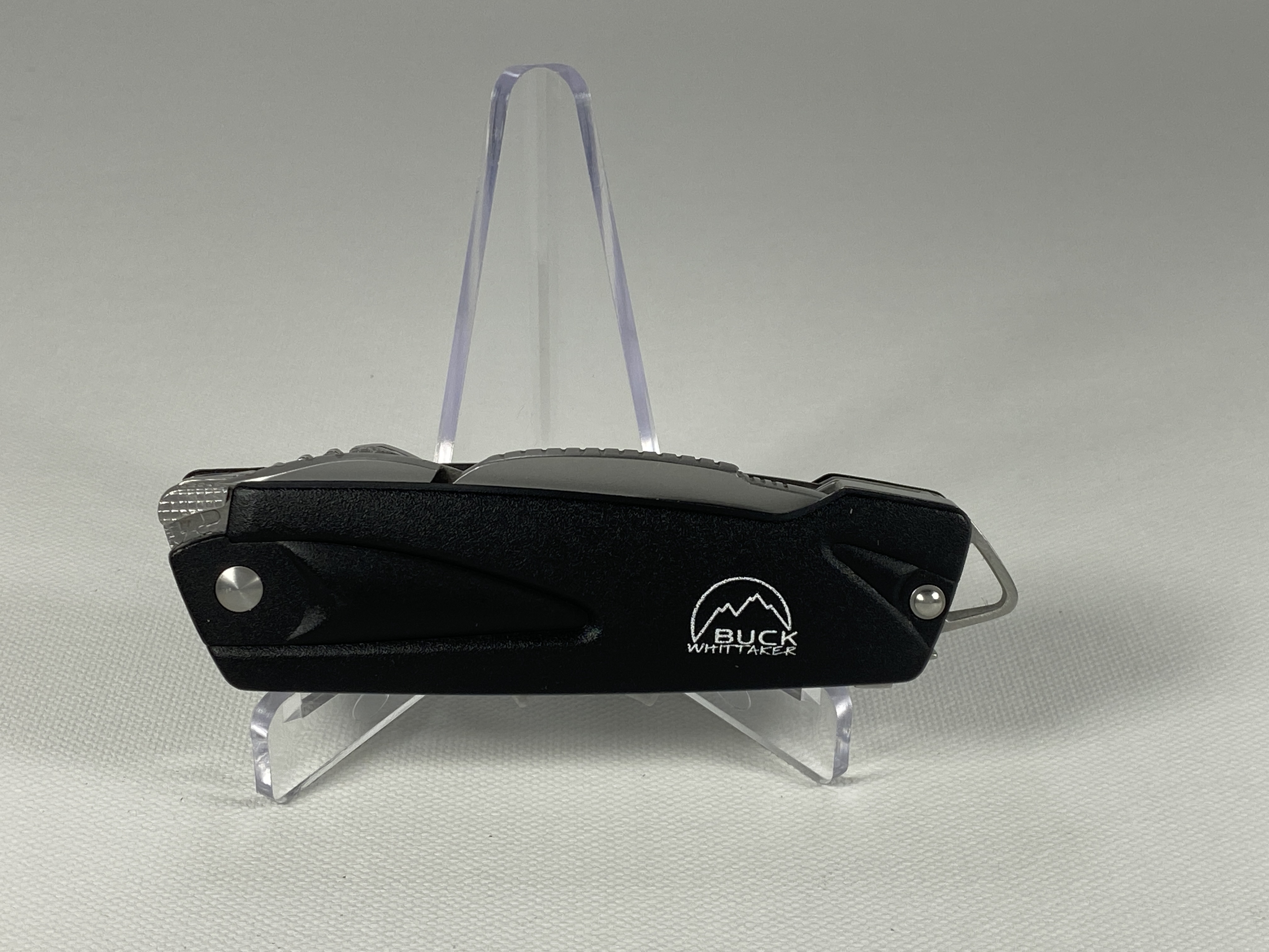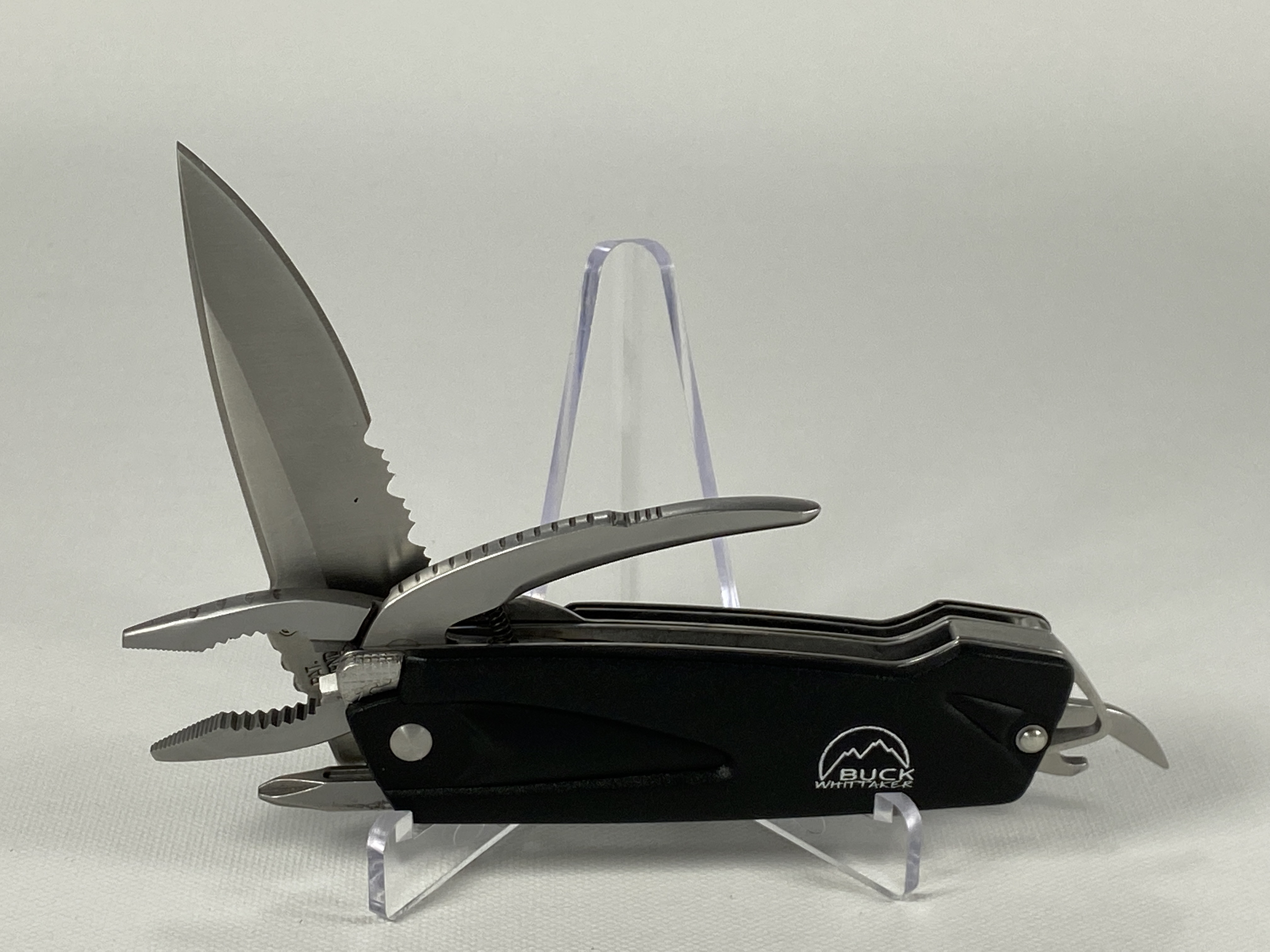 March 14, 2026 - Multi-Tool includes knife, pliers, flathead, philips, and can opener. 4-1/8 inches closed. 7-1/4 inches open. Made in China. Front Tang: 730 (2007 Symbol) ; Front Blade Etch: BUCK ; Rear Tang: PAT. PEND. CHINA. Stainless Steel blade. Black Thermoplastic handle. Stainless Steel liner.