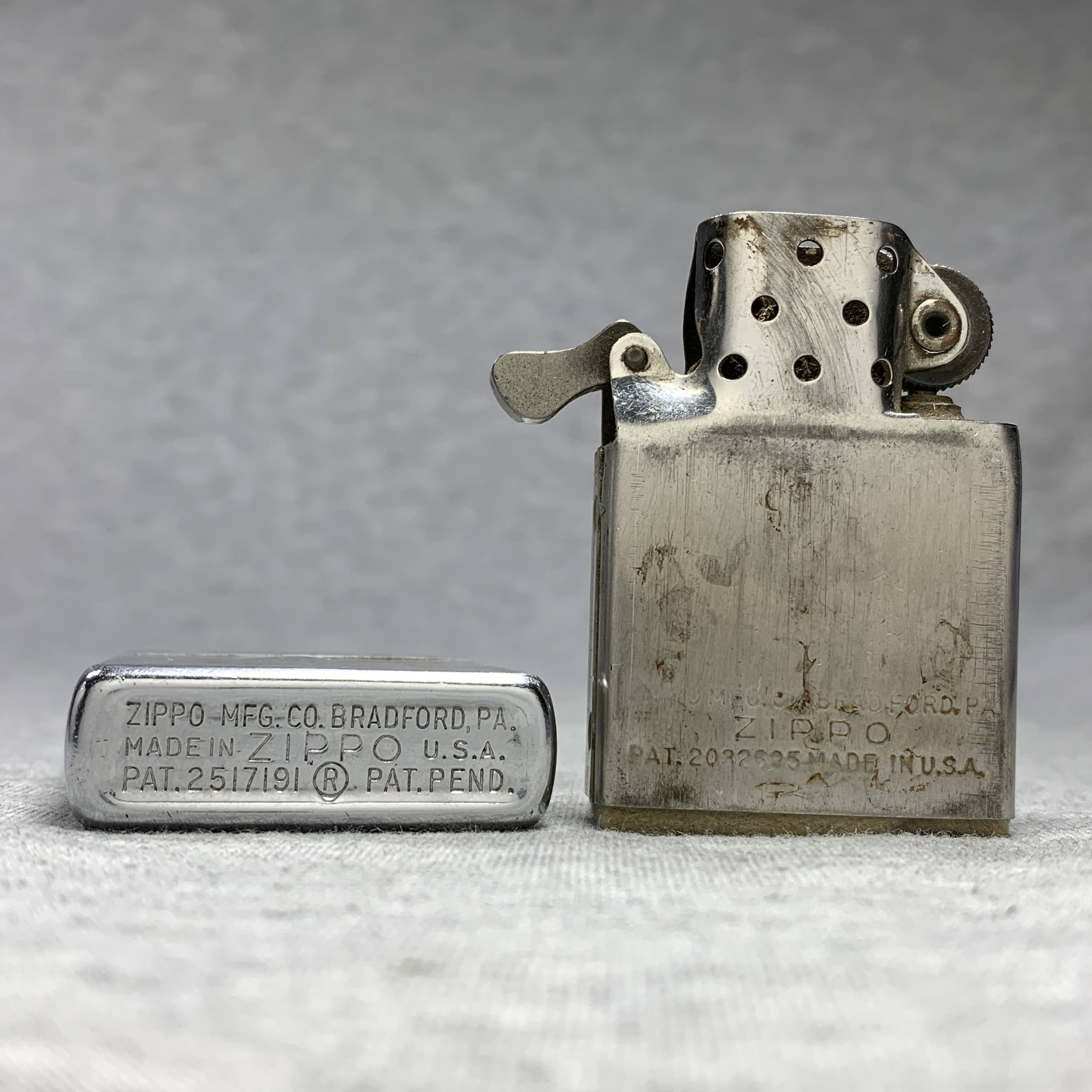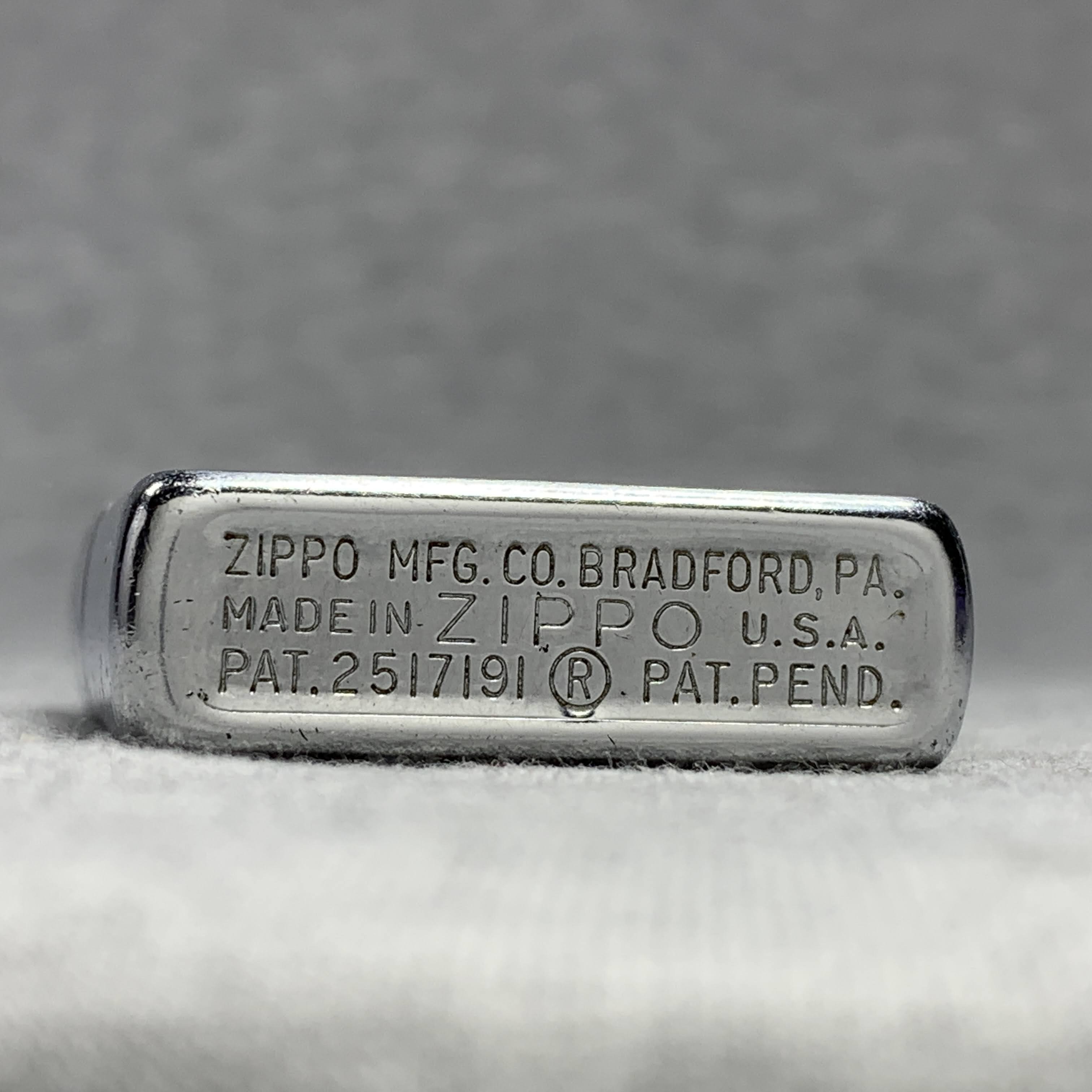 March 25, 2026 - Chrome-plated steel with front design. 5 barrel hinge. Standard size 1-7/16 inches wide by 2-1/4 inches high. Bottom of lighter reads: ZIPPO MFG. CO. BRADFORD, PA. MADE IN ZIPPO U.S.A. PAT. 2517191 (R) PAT. PEND. Insert has patent number 2032695.