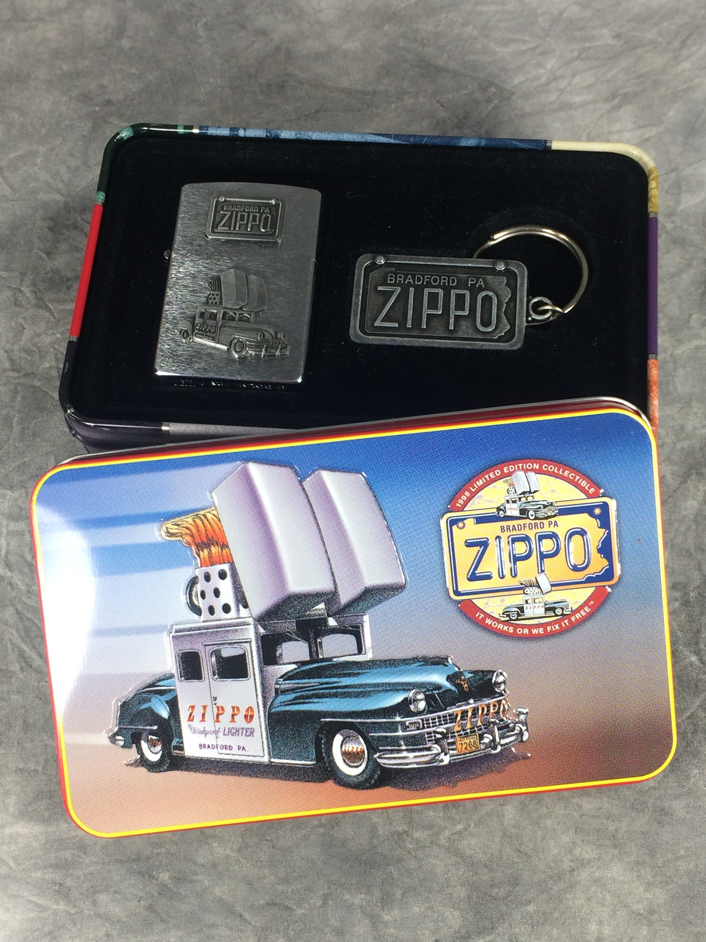 March 25, 2026 - ZIPPO 1947 CHRYSLER Limited Edition Lighter and keychain set, manufactured in 1998. Brushed chrome finish over solid brass with front emblems. Standard size 1-7/16 inches wide by 2-1/4 inches high. Bottom of lighter reads: B Zippo XIV Bradford, PA. Made in U.S.A.