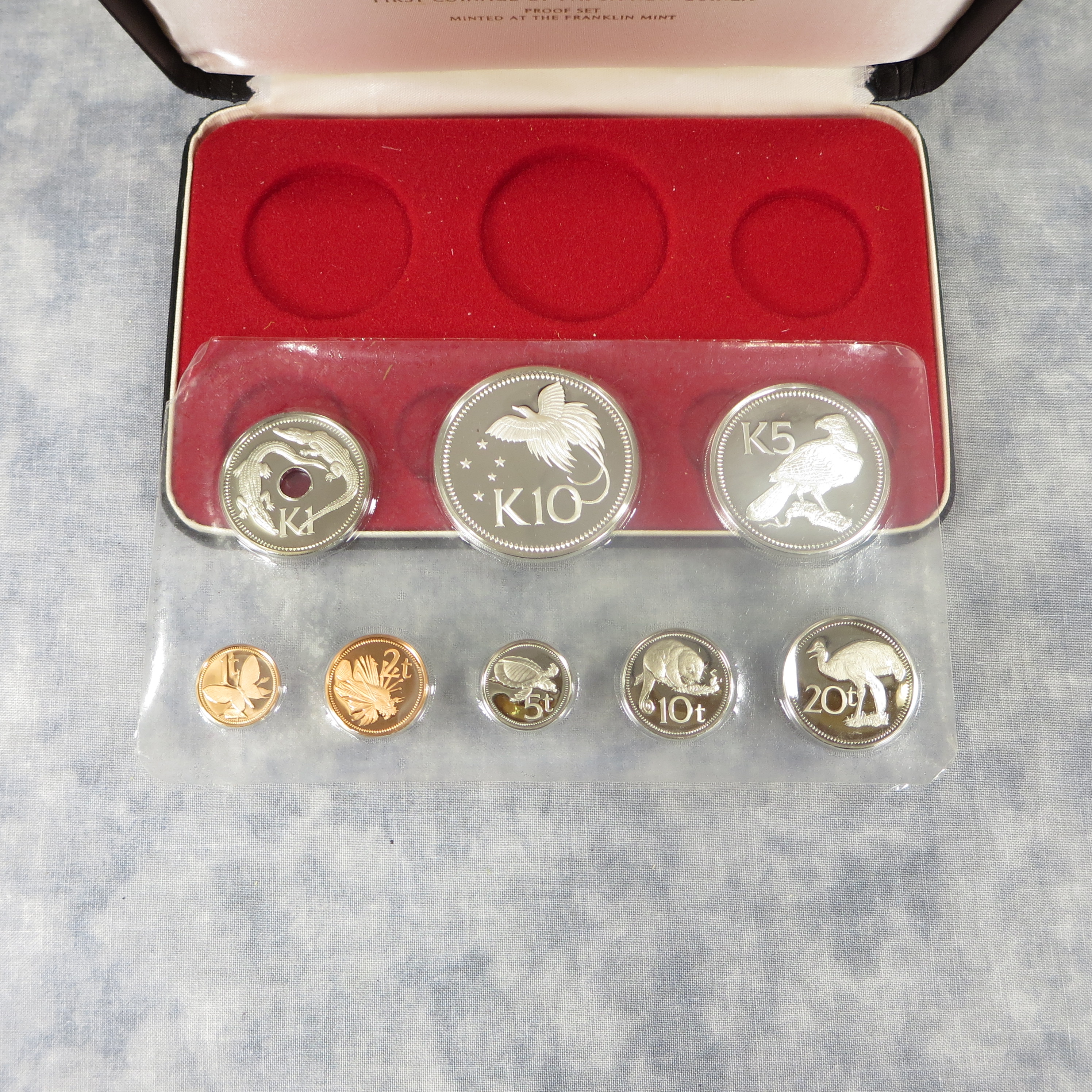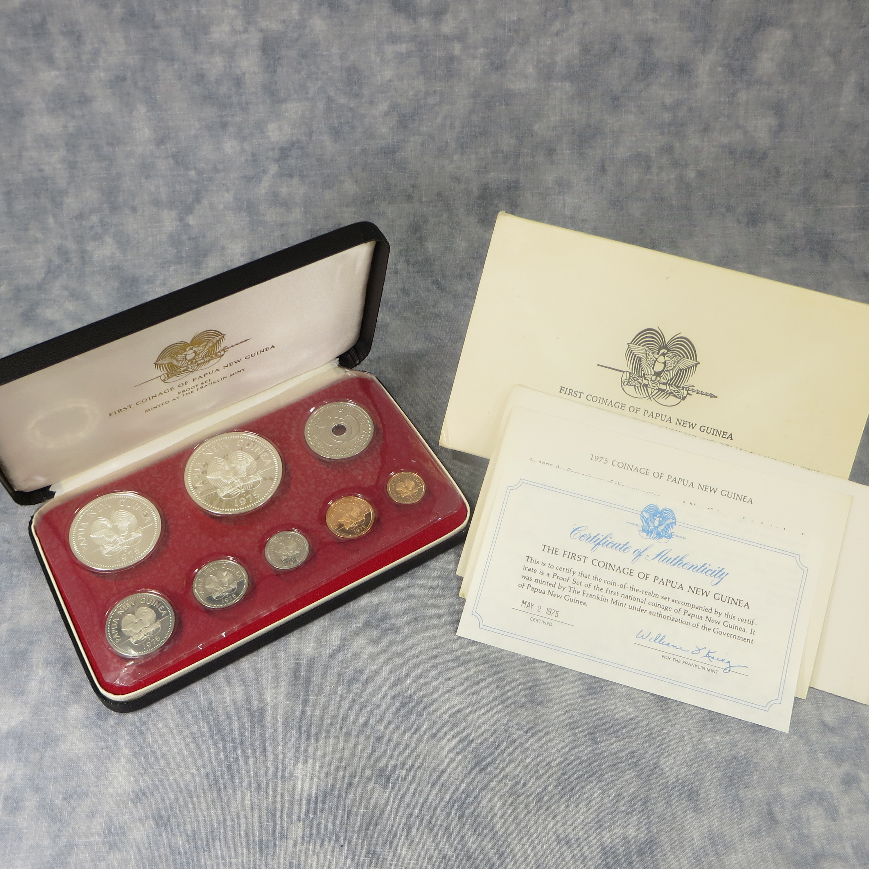 November 04, 2025 - Certified May 2, 1975. The K10 and K5 coins are sterling silver. 8 coin set housed in original presentation case with certificate of authenticity, info card and outer sleeve embossed 'First Coinage of Papua New Guinea Proof Set Minted at The Franklin Mint'.