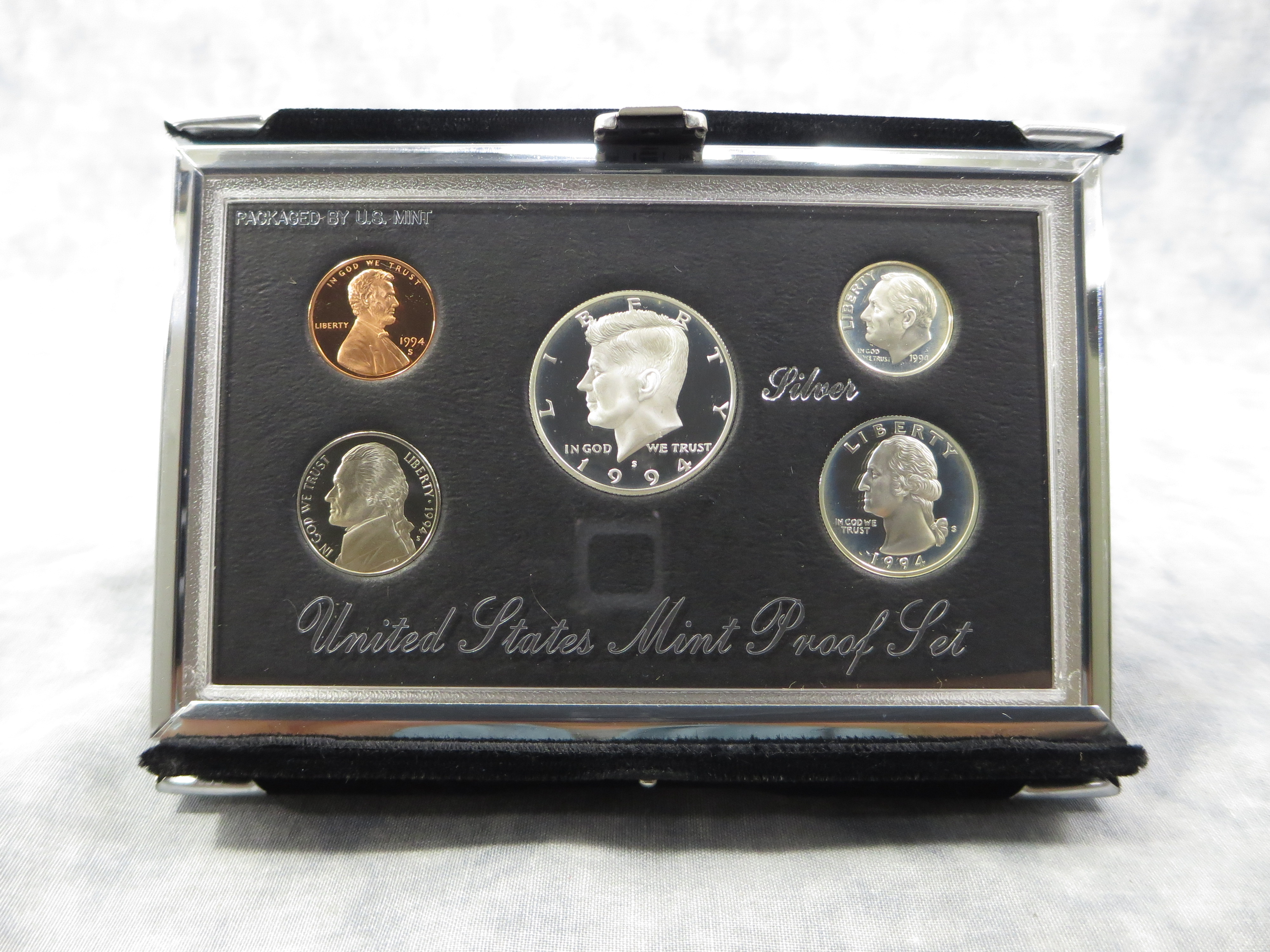 March 27, 2026 - San Francisco Mint. Five coin silver proof set includes a 90% silver Kennedy half dollar, Washington Quarter and Roosevelt Dime as well as a Jefferson Nickel and Lincoln cent, all from 1994. Housed in a deluxe velvet display case, with information card/certificate of authenticity, and housed in an official United States Mint black box.