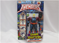 Metallic silver body with yellow eyes. Blue nodule in forehead. Blood spattered silver blades.