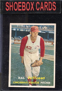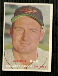 For 1957, Topps reduced the size of its cards to the now-standard 2-1/2" by 3-1/2." Set size was increased to 407 cards. Another change came in the form of the use of real color photographs as opposed to the hand-colored black and whites of previous years. For the first time since 1954, there are also cards with more than one player. The two, "Dodger Sluggers" and "Yankees Power Hitters" began a trend toward the increased use of multiple-player cards. Another first-time innovation, found on the backs, is complete player statistics. The scarce cards in the set are not the highest numbers, but rather numbers 265-352. Four unnumbered checklist cards were issued along with the set. They are quite expensive and are not included in the complete set prices quoted below.