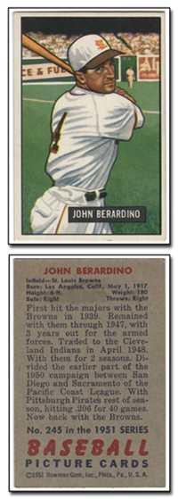 In 1951, Bowman increased the number of cards in its set for the 3rd consecutive year when it issued 324 cards. The cards are, like 1950, color art reproductions of actual photographs but now measure 2-1/16" by 3-1/8" in size. The player's name is situated in a small, black box on the card front. Several of the card fronts are enlargements of the 1950 version. The high-numbered series of the set (#'s 253-324), which includes the rookie cards of Mantle and Mays, are the scarcest of the issue.