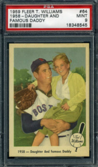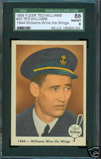 The 80-card 1959 Fleer set tells of the life of baseball great Ted Williams, from his childhood years up to 1958. The full-color cards measure 2-1/2" by 3-1/2" in size and make use of both horizontal and vertical formats. The card backs, all designed horizontally, contain a continuing biography of Williams. Card #68 was withdrawn from the set early in production and is scarce. Counterfeit cards of #68 have been produced and can be distinguished by a cross-hatch pattern which appears over the photo on the card fronts