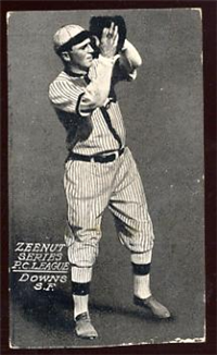 The card issued as part of the very rare "Big Eater" set, issued circa 1911. The set includes only members of the Pacific Coast League Sacramento Solons. The black and white cards are unnumbered and measure 2-1/8" by 4" and feature action photos. The lower part of the card contains a three-line caption that includes the player's last name, team designation (abbreviated to "Sac'to"), and the promotional line: "He Eats 'Big Eaters'." (Although the exact origin is undetermined, it is believed that "Big Eaters" were a candy novelty.)