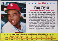 Over a two year period, Fleer issued another set utilizing the Baseball Greats theme. The 154-card set was issued in two series and features a color player portrait against a color background. The player's name is located in a pennant set at the bottom of the card. The card backs feature orange and black on white stock and contain player biographical and statistical information. The cards measure 2-1/2"by 3-1/2" in size. The second series cards (#'s 89-154) were issued in 1962.