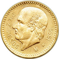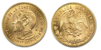 5 Pesos gold coin. Note: from 1955-1972 almost 2 million of these coins were restruck by the Mexico Mint.