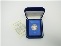 This coin weighs 42.1 grams (650 grains) of pure sterling silver and measures 1 3/4 inches (45mm) in diameter. Minted in Proof Quality by The Franklin Mint under authorization of the Jamaican government. Certified September 9, 1974.