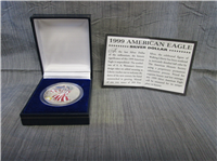 Includes American Eagle uncirculated silver dollar, one troy ounce of pure .999 fine silver, in original velvet display case and US Mint box, with certificate of authenticity.