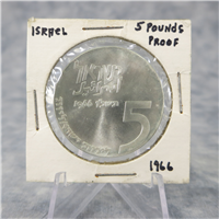 Obverse: Inside a somewhat concave surface in the upper left corner, the word "Israel" in Hebrew and Arabic. Beneath, the mint year "5726-1966" in Hebrew and English. Around the lower border, the face value "5 Israeli Lirot" in Hebrew.