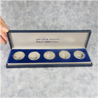 This set includes the .835 silver 20 Drachmai coin as well as the 10, 5, & 2 Drachmai, 1 Drachma, and 50 & 10 Lepta that contain no silver.