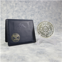 1-1/2 diameter coin sealed in plastic and housed on tri-fold information card.