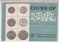 The 6 coin set includes the 1 Agora, 5, 10 and 25 Agorot, 1/2 and 1 Lira coins, sealed in original hard plastic display with box and description card. Official issue of the Government of Israel, distributed by Israel Government Coins and Medals Corporation.