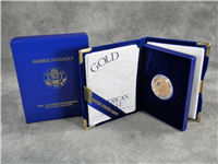 One ounce ($50) American Eagle Proof has the West Point mint mark. Housed in the original velvet display case and with the dark blue outer box. Original Certificate of Authenticity is intact. The coin weighs 33.93 grams and is made of 91.6% gold, for a net bullion value of one troy ounce (31.1 grams) of pure gold.