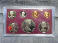 The 1975 Barbados proof set consists of 8 proof-quality coins (the $10 coin is .925 fine solid sterling silver, $5 coin is .800 fine silver, $2, $1, $.25 and $.10 coins are cupro-nickel, $.05 coin is brass and the $.01 coin is bronze). The coins are sealed in plastic over a cardboard holder, and housed in a heavy black display. Includes Certificate of Authenticity dated September 22, 1975 and separate information card.