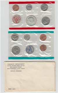 Denver, Philadelphia and San Francisco Mint. Face value: $1.83. Includes half dollar, quarter, dime, nickel, and penny from Denver Mint and Philadelphia Mint plus a Lincoln Cent from the San Francisco Mint. Each Mint Set is sealed in a cellophane wrapper with a special token indicating which Mint the coins came from. The set is contained in a white Department of the Treasury envelope.