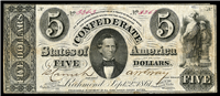 178,716 issued. Black. Blank back. Hope with anchor at center, R.M.T. Hunter left, C.G. Memminger right. Lithographic date, 'September 2, 1861'. Printed by Keatinge & Ball, Richmond, Va. Contemporary counterfeits are known and are of similar value.
