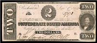 514,400 issued. Black with vermillion X X overprint. Blank back. Hope with anchor at center, R.M.T. Hunter left, C.G. Memminger right. Lithographic date, 'September 2, 1861'. Printed by Keatinge & Ball, Richmond, Va. Contemporary counterfeits are known and are of similar value.