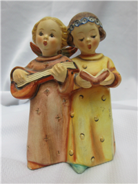 Originally modeled in 1935 by master sculptor Reinhold Unger. Many variations through the years. On older models the candleholder is much taller than on the newer ones. The order of placement of the angels may vary on the older models. Current production pieces have a half-inch wider base. Early "crown" mark examples are sometimes found with light purple shoes rather than the dark brown shoes found on newer models. "Herald Angles" candleholder was (TW) "Temporarily Withdrawn" from production on 31 December 1989 A few sample pieces have been found decorated with bright colors and glossy finish of the "Faience" technique.