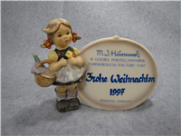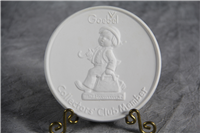 4 inches in diameter. Front is embossed 'Wir Danken Fur Ihren Besuch' (translates 'Thank You For Your Visit') and an image of the Merry Wanderer figurine. The Goebel TMK 6 and 1995 imprinted in blue on back of plaque. The following is imprinted in black ink on back of plaque: Kitzingen 1250 Jahre logo and 'M.I. Hummel Ausstellung IM Hist. Rathaus - Porzellanhaus I.M. Below. Kitzingen'.