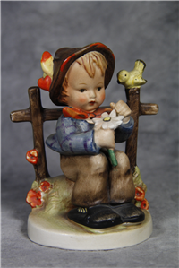 5-1/8 inches tall on a 3-3/4" square base. GOOD FRIENDS figurine is 3-3/4 inches tall. SHE LOVES ME, SHE LOVES ME NOT figurine is 4 inches tall. Goebel TMK 3 trademark imprinted on the front of each base.