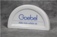 2-1/4 inches tall. Goebel TMK 6 trademark imprinted in blue on bottom of base. The middle of the sign is recessed. Both sides are imprinted with 'Goebel and' and 'Alles was schon ist'.