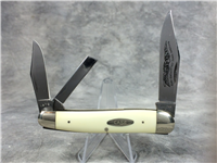 Limited Edition. 3-3/4 inches closed. 6-5/8 inches open. Made in USA. "CASE XX USA **** " (4 dot) and "4380" tang stamps. Single oval open C "CASE" shield. Chrome vanadium blades. Master blade etched "NATIONAL KNIFE COLLECTORS - 1976" and with the image of an eagle holding a banner that reads "ONE OF 3000". Smooth white composition handle. Nickel Silver bolsters and liner. Front right bolster etched with serial .