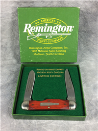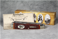 Serial # 18875. 3-7/8 inches closed. 6-3/4 inches open. Made in USA. 'Remington UMC Made in USA' tang stamp. Shotgun Shell shield. Stainless Steel blades. Red Saw Cut Delrin handle. Nickel Silver bolsters. Brass liner. With original box.