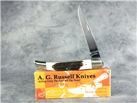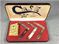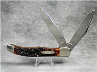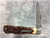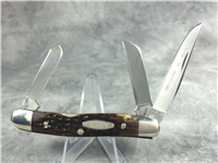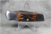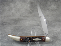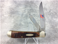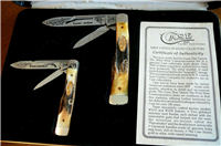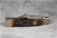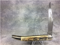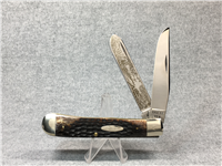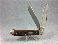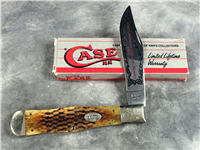 Limited Edition of 250 produced. 3-3/4 inches closed. 6-3/4 inches open. Made in USA. " x*x Case XX x x x " (with lightning bolt S) and "USA 5185 SS" tang stamps. Stainless steel blades. Main blade etched with "GENUINE STAG" logo on front and serial # on back. Genuine burnt stag handle. Oval closed-C "CASE xx" shield. Scrolled Nickel Silver bolsters. Brass liner.