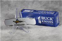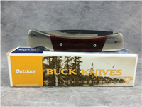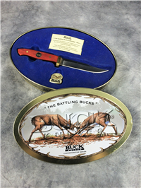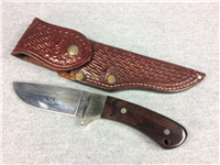 Fixed Blade Knife. 8-1/8 inches long. "BUCK" and "TAIWAN" tang stamps. Wood handle. Round "Buck Knives" shield. With original oval gift tin and lapel pin.