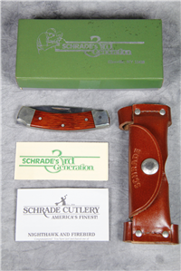 2-Blade Folding Hunter Knife. 5-1/4 inches closed. 9-1/4 inches open. Made in USA. "SCHRADE U.S.A. 260SC" tang stamp. Stainless Steel blades. Nickel Silver bolsters. Brass liner. With original box, leather sheath, and paperwork.